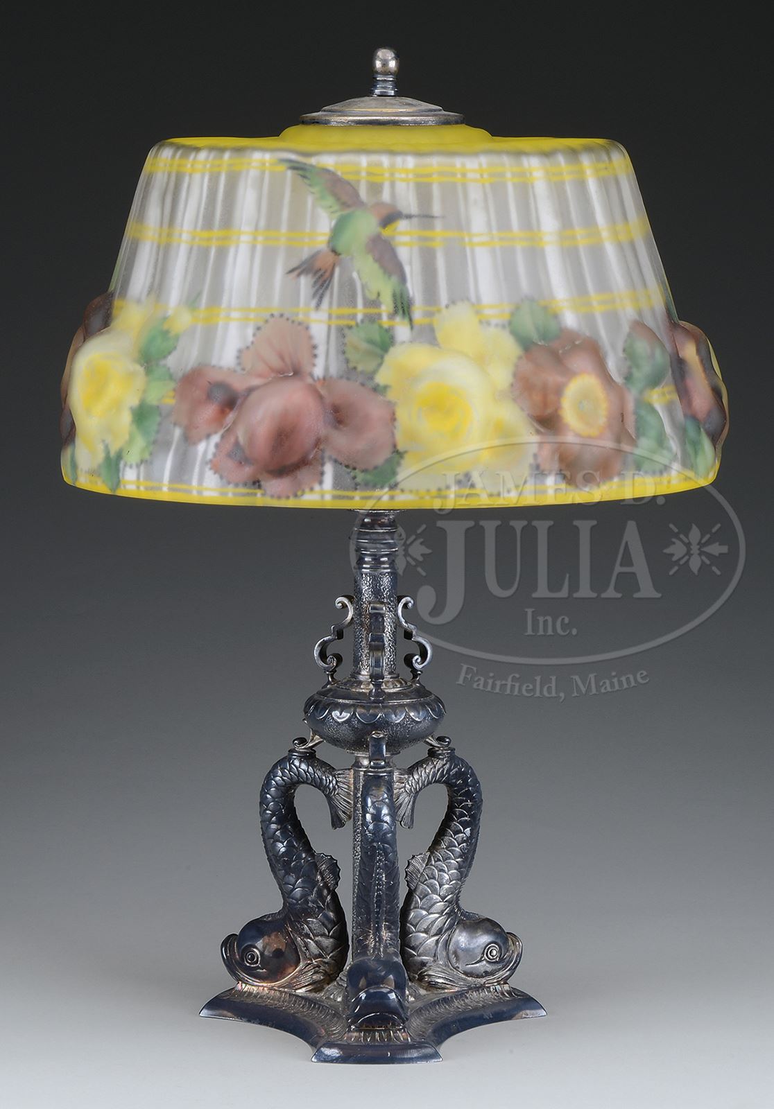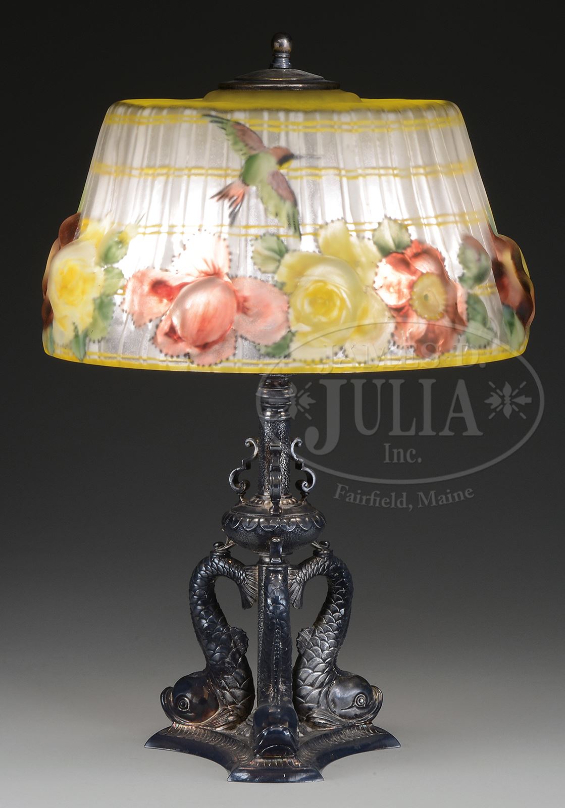 PAIRPOINT PUFFY HUMMINGBIRD TABLE LAMP.Pairpoint table lamp has band of puffy flowers encircling bottom half of shade with flowers being done in yellow, pink and red. Shade is further decorated with puffy hummingbird on front and back. Puffy design is set against a vertically ribbed frosted body with yellow and white plaid background. Top of shade has ribbed surface and is finished in pastel yellow. Unsigned. Shade rests on an original Pairpoint dolphin base with two socket cluster and has silver finish. Signed on underside “Pairpoint” along with Pairpoint logo and “D3076-1/2”. SIZE: Shade is 14″ dia. Lamp is 20″ t. PROVENANCE: From the Unreserved Collection of Dr. & Mrs. Brian Bojesen. CONDITION: Shade is very good to excellent. Base is very good with wear and discoloration to finish. Sockets are replacements. Re-wired with contemporary plastic cord. 50361-23 (2,000-2,500) – Lot 1337