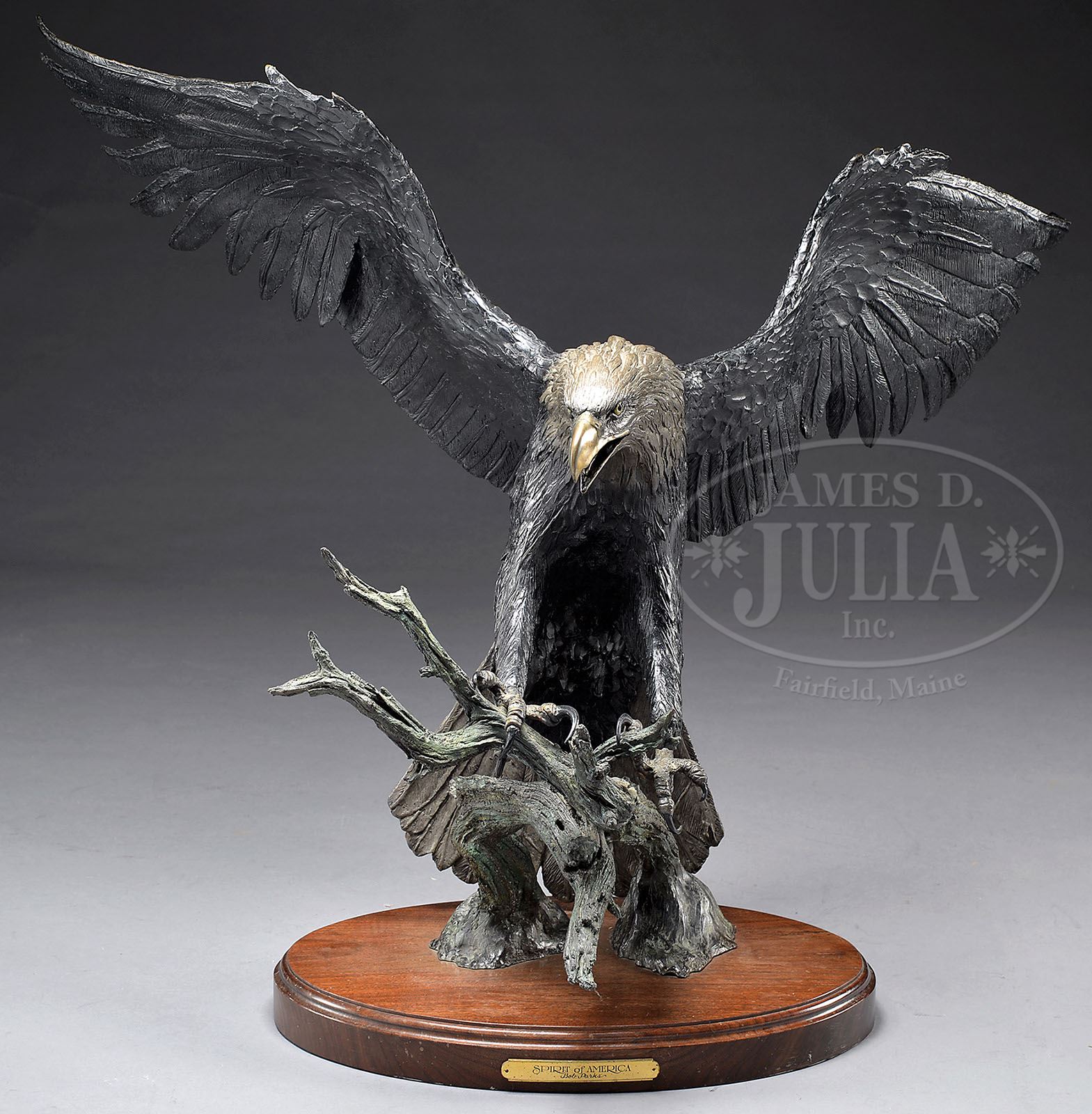 BOB PARKS (American, 1948- ) “SPIRIT OF AMERICA”. Patinated bronze Signed “Bob Parks” and numbered out of an edition of 35 SIZE: Bronze only: 32″ h. Total: 35″. Wingspan: 41-1/2″ w x 35″ d. CONDITION: Very good with wonderful multi-colored patina. 9-90067 (3,000-5,500)
