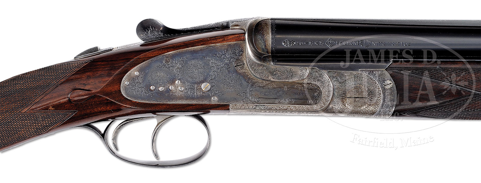 *SWEET LITTLE WOODWARD 20 BORE OVER-UNDER SIDELOCK EJECTOR HEAVY PROOF GAME SHOTGUN WITH CASE AND ACCESSORIES.SN 7076. Cal. 20 ga. 2-3/4″ Chambers. 26″ Demi-bloc bbls with narrow, matted game rib, are engraved “James Woodward & Sons. 64 St. James’s Street. London. England.” on left side of top bbl, with London nitro proofs for 2-3/4″ chambers on right side and bbl flat. Small sized, case hardened, low profile, OU sidelock action features automatic safety (SAFE inlaid in gold), gold band tumbler end cocking indicators, and dbl triggers. Action and lockplates are engraved with typical Woodward house rose and scroll. “J. Woodward & Sons” is in parchment scroll flanked device on each lockplate, and bottom of rounded action bar is engraved “Woodward’s” “Patent” “Under & Over”. Rose and scroll engraved trigger guard has SN on tang. Nicely streaked and lightly fiddle figured lightweight European walnut straight grip buttstock measures 14-7/8″ over checkered wood butt, and features typical drop points in front of semi-diamond hand with point pattern checkering. A vacant silver oval is on toe line. Matching slim ejector forend has Anson release. Bore diameter: top -.613, bottom – .613. Bore restrictions: top – .009 (lt mod), bottom – .006 (IC). Wall thickness: top – .022, bottom – .026. Drop at heel: 2-3/8″, drop at comb: 1-5/16″. Neutral cast. Weight: 6 lbs. 0 oz. LOP: 14-7/8″. What is possibly orig, makers leather case is lined in scarlet cloth, and has paper Woodward label along with instruction labels for under-over gun, in lid. Case contains Vulcanite covered 2-pc cleaning rod, pair of horn bodied Woodward marked snap caps, small nickel striker bottle with spare strikers, Woodward marked 20 bore chamber brush with horn handle, along with matching turnscrew, horn striker block, Woodward marked glass oil bottle, two Japanned Woodward marked tins (one for gun oil), black morocco wallet with pull through cleaning kit, and brown wallet with brush and mop. Small covered compartment holds broken case extractor and two keys. PROVENANCE: G & H letter confirming specs indicating that this gun was orig made with single trigger in 1936, and sold to Mr. Dean Witter, co-founder of Dean Witter and Co. CONDITION: Excellent, as partially refurbished. Bbls retain nearly all of a fine quality re-blue, with a few light subsequent marks. Action retains 30 – 40% orig case hardening color. Lockplates retain nearly all of their fine orig color. Top lever and trigger guard retain most of their orig bright blue, trigger guard silvering at tang. Newly made correctly shaped buttstock retains essentially all of its hand rubbed oil finish. Orig forend wood finished to match, checkering correctly freshened. Bores are excellent. Action is tight. Bbls are on face. Ejectors are strong and in time. Case leather is still relatively light in color with scuffs on edges and corners, as well as a few overall. Orig straps and handle are good. Interior cloth is fine with light soiling and compressions from contact with gun and accessories. Labels are fine with light soiling, some foxing. Accessories are fine to very fine. 51497-5 MGM93 (25,000-35,000) C&R – Lot 1339 Click here to view provenance