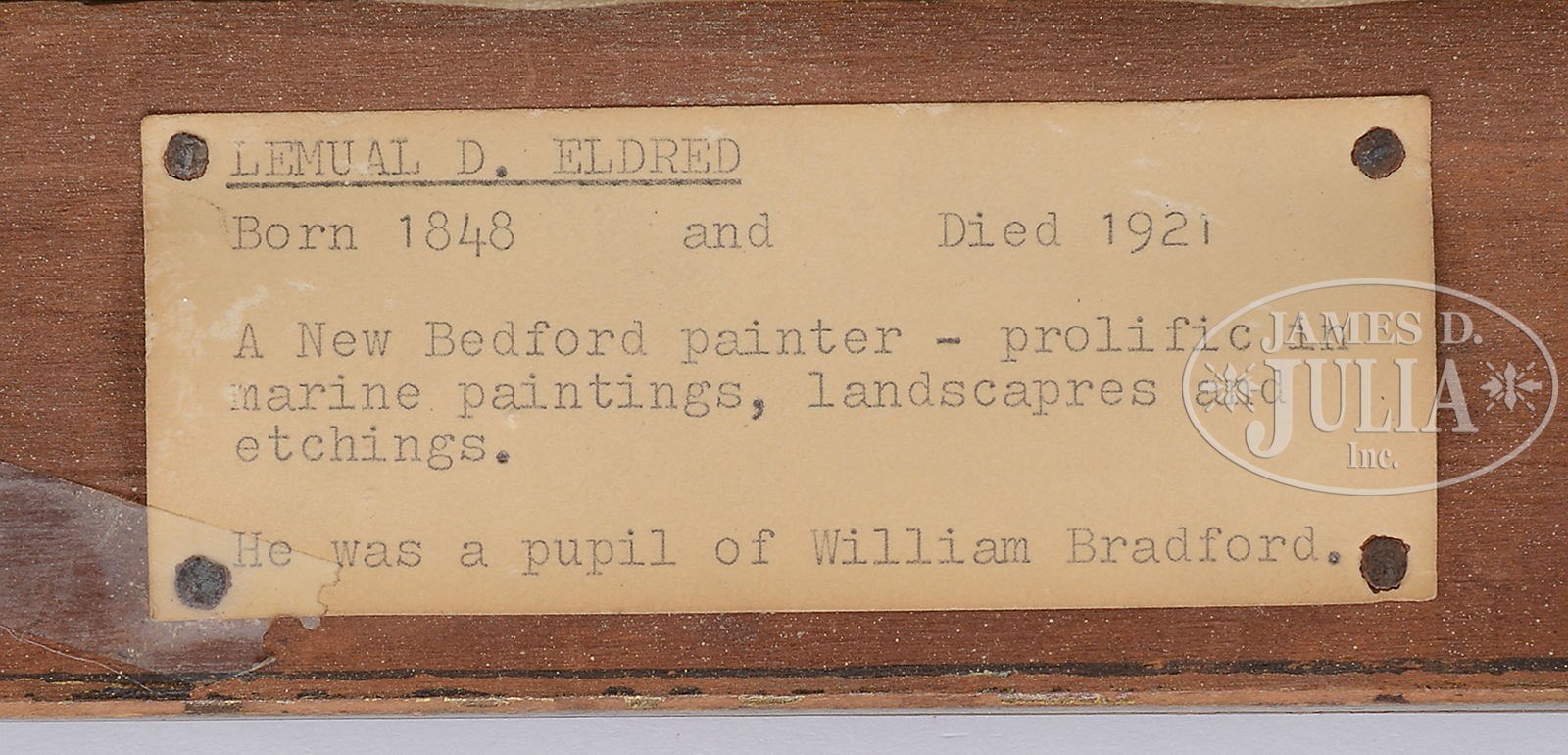 LEMEUL D. ELDRED (American, 1848-1920) WHALER AT SEA.Oil on canvas portrait of a three-masted schooner in full sail flying an American flag with a steam ship in the distance. Gray and pink clouds with a hint of blue sky with white tipped choppy seas. Housed in a period carved gilt wood frame bearing a New Bedford framers label. Signed lower right “L.D.Eldred”. Bears Vose Galleries label on verso with artist, title, and dated circa 1880. SIZE: 22″ x 36″. Overall 26-3/4″ x 40-1/2″ CONDITION: Overall good, vertical craquelure, touch up in steamship, areas of restoration in background sky. 9-94532 (5,000-7,000) – Lot 1340