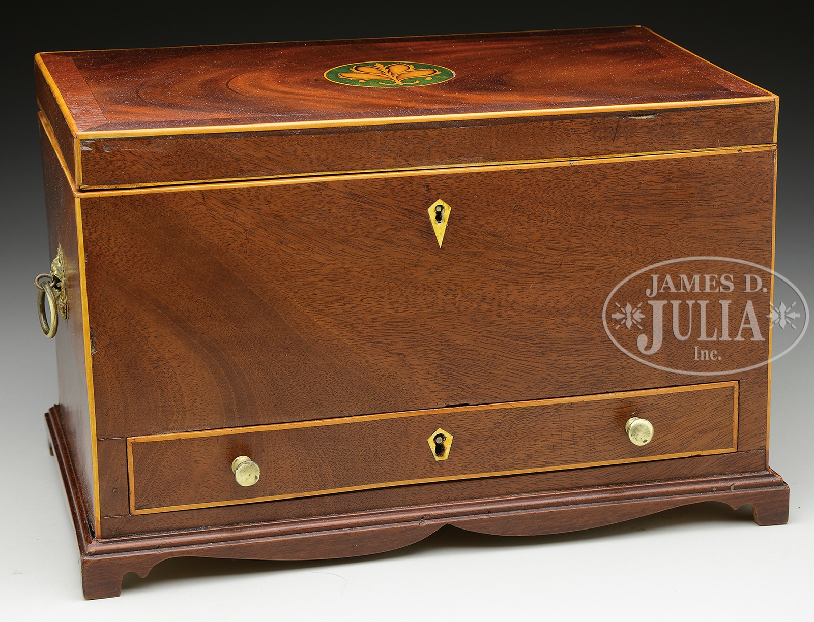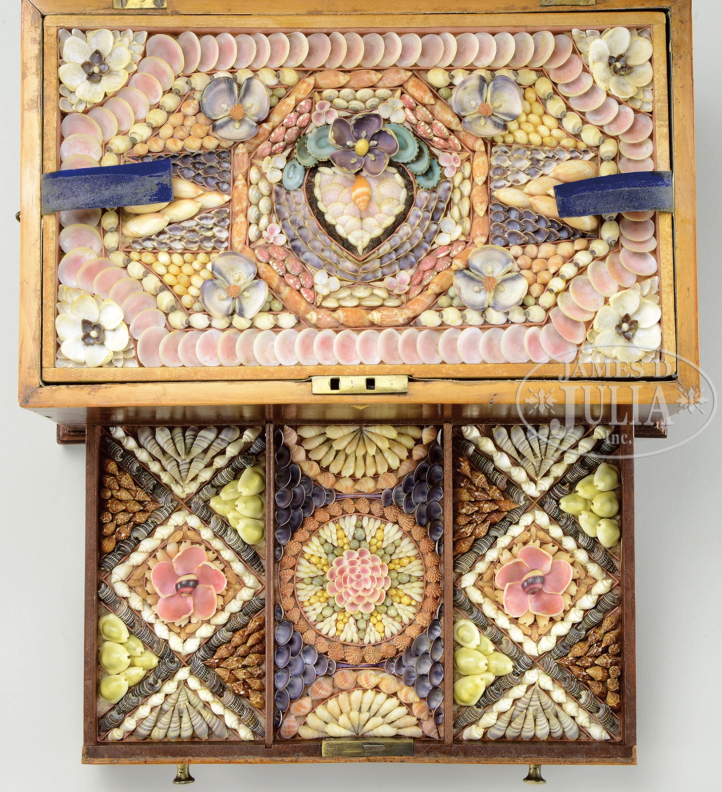 Please note: We do not guarantee the age of this item. RARE MAHOGANY JEWEL CHEST FITTED WITH SAILOR’S VALENTINES.Early 19th century. England or America. The top with crotch veneer mahogany background with mahogany and satinwood banding, and foliate inlay cartouche. The case with satinwood corner trim and a bracket base fitted with a drawer having brass pulls. Interior of top fitted with a pull out tray, having an elaborate and colorful seashell arrangement centering on a heart “Sailor’s Valentine”. When removed reveals a compartment for storing jewelry. And the drawer when pulled out reveals another triple panel “Sailor’s Valentine.” SIZE: 13″ x 8-1/2″ x 8-1/2″ t. CONDITION: Very good, case refinished, shell art intact. 9-96546 (2,000-3,000) – Lot 1342