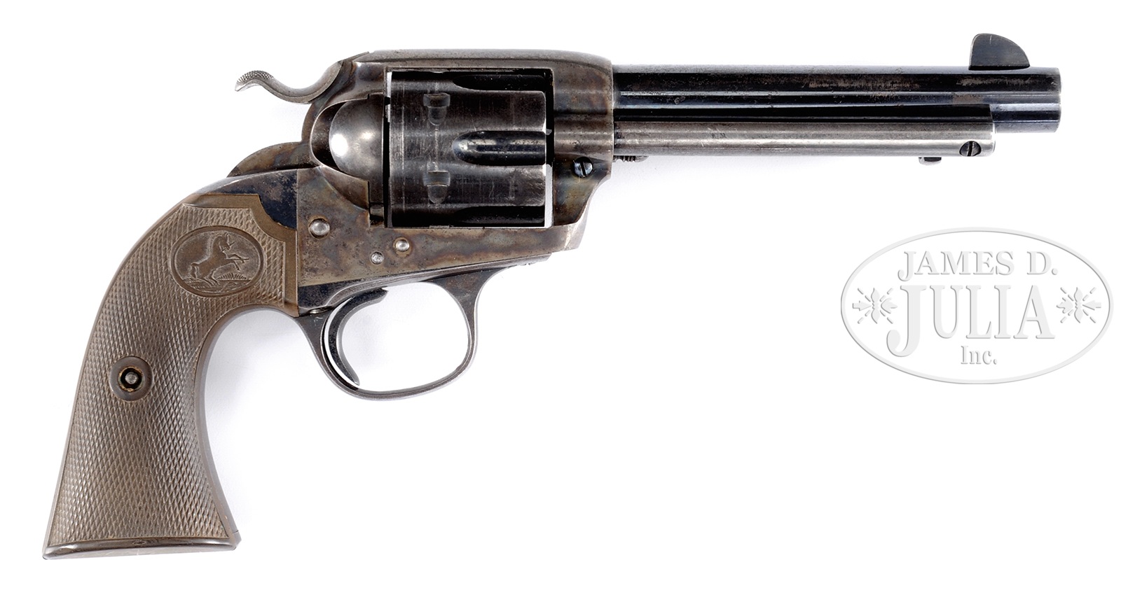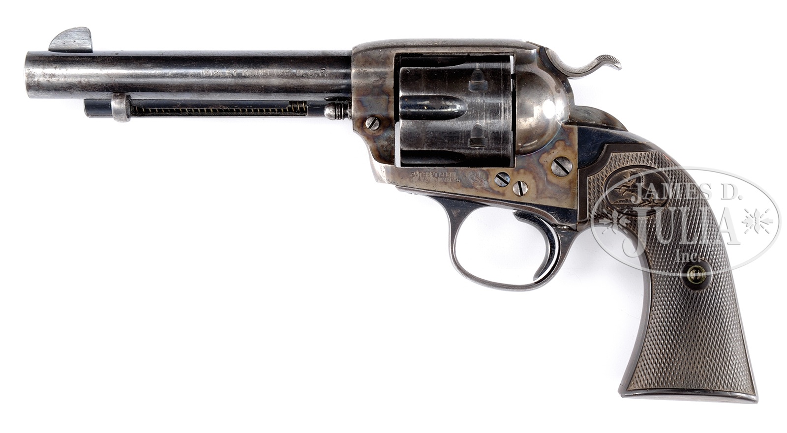 *COLT SINGLE ACTION ARMY BISLEY MODEL REVOLVER WITH CHECKERED HARD RUBBER GRIPS WITH COLT MEDALLIONS.SN 322219. Cal. 38 WCF. 5 1/2″ bbl. Blue and case colored finish. Checkered hard rubber grips with Colt medallions. Matching serial numbers on frame, trigger guard, backstrap, and grips. All other markings standard for this revolver. PROVENANCE: The Dr. Robert G. Cox Estate Collection. CONDITION: Very good. Bbl retains 50% bright blue with most of wear on left side toward muzzle. Front sight is full-sized. Bbl markings are sharp. Bore is frosty with strong rifling. Ejector rod housing retains 50% bright blue with most of wear on outer edge. Frame retains 40% muted case color with some vivid color in the gullet in front of cylinder. Patent mark is sharp. Hammer retains 40% case color with some slight wear marks on left side. Trigger retains 40% fire blue. Screws are good with some fire blue remaining. Cylinder retains 20% bright blue especially in flutes with a slight drag mark the rear end. Trigger guard and backstrap retain 20% blue in protected areas with balance turning a pleasing plum-brown patina. Grips are very good with sharp checkering and medallions. Grips are turning brown as is common with this vintage Colt. Action functions well. A nice late production Bisley revolver. 50019-221 TEP C&R (2,500-3,500) – Lot 1342 Click here to view provenance