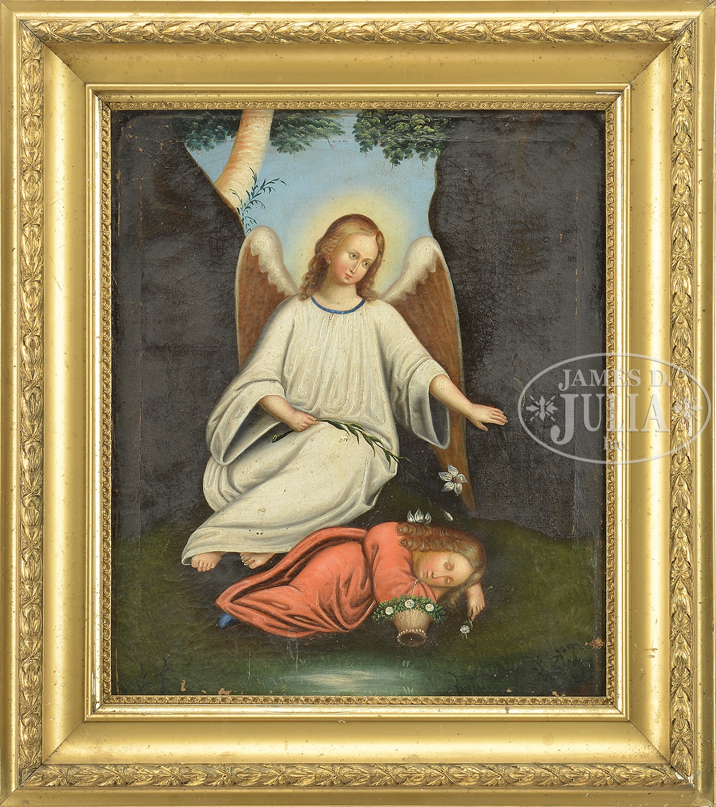 UNSIGNED (19TH Century) GUARDIAN ANGEL.Oil on canvas Housed in an antique gesso decorated frame with gilt liner Unsigned SIZE: 27″ x 21-1/2″ Overall: 34-1/2″ x 30-1/2″ CONDITION: Craquelure, surface dirt, some chipping to bottom section 9-94040 (2,000-3,000) – Lot 1343