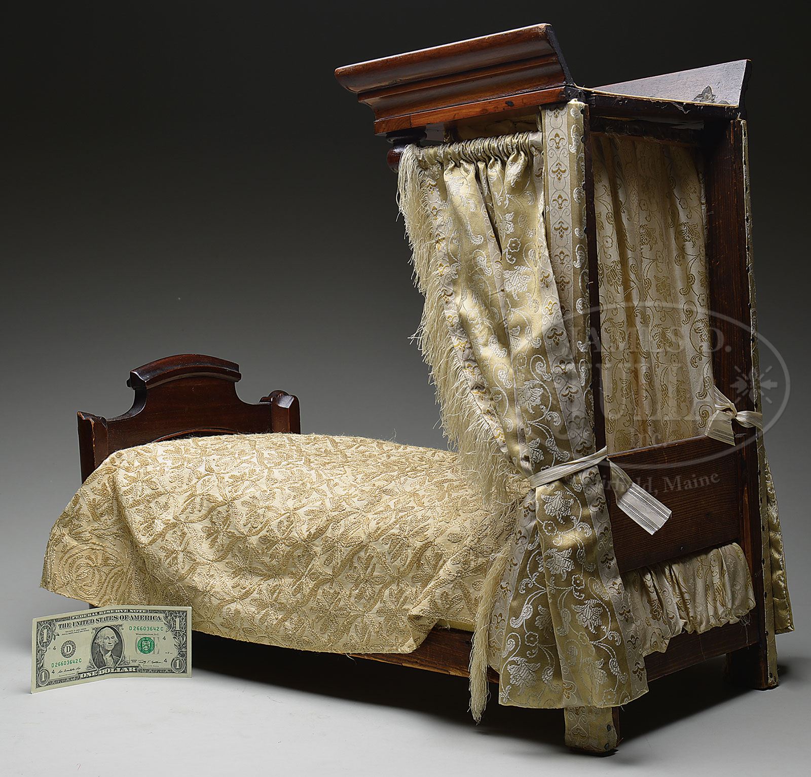 DOLL TESTER BED.Nicely carved walnut bed with formed head and foot board. Headboard features turned drop pendants and has been upholstered with vine and fleur de lis woven fabric. SIZE: 23″ l x 12″ w x 22-1/2″ h. CONDITION: Headboard and foot board slightly loose. Otherwise generally good to very good with replaced bedding. 1-14385 (600-1,200) – Lot 1343 Auction: Advertising, Toy & Doll Auction - Fall 2014 Please Note: All prices include the hammer price plus the buyer’s premium, which is paid by the buyer as part of the purchase price. The prices noted here after the auction are considered unofficial and do not become official until after the 46th day. |