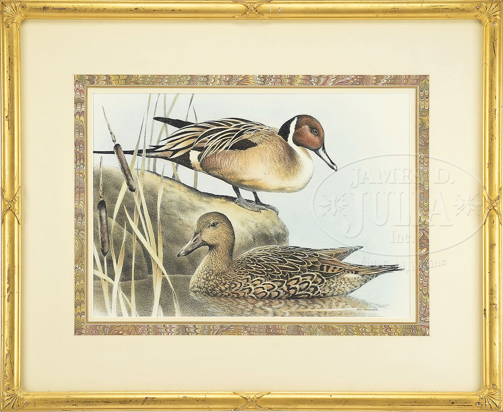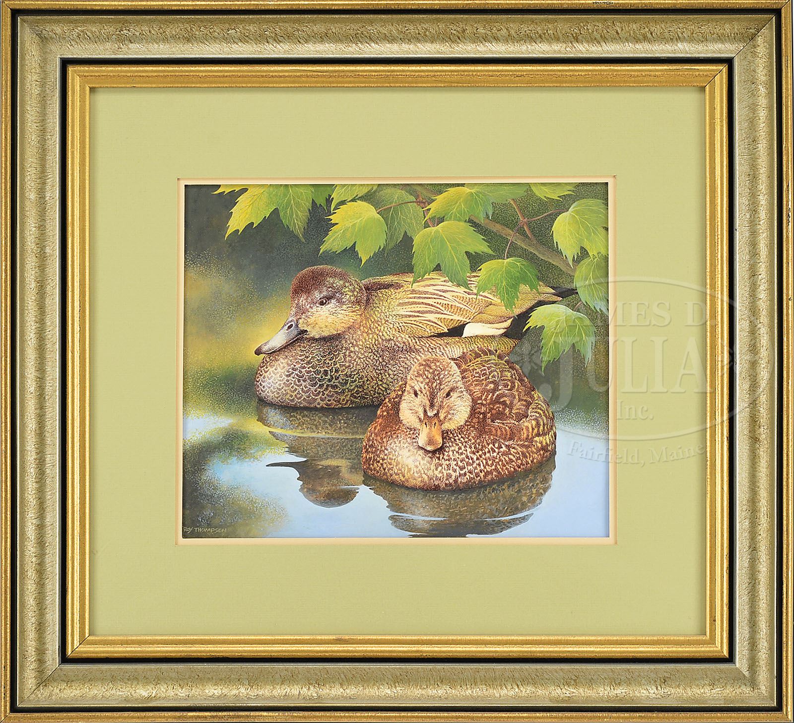 ROY THOMPSEN (American, 1928-) FOUR WORKS OF DUCKS. Two oils & two acrylics Housed in decorative gilt & partial gilt frames All signed “Roy Thompsen” SIZE: Smallest to largest: Sight: 5″ x 7″ to 13-1/2″ x 18″ 0verall: 8-1/2″ x 10-1/2″ to 21″ x 26″ PROVENANCE: Massachusetts National Fire Protection Association CONDITION: Very good 7-70438 (300-500)