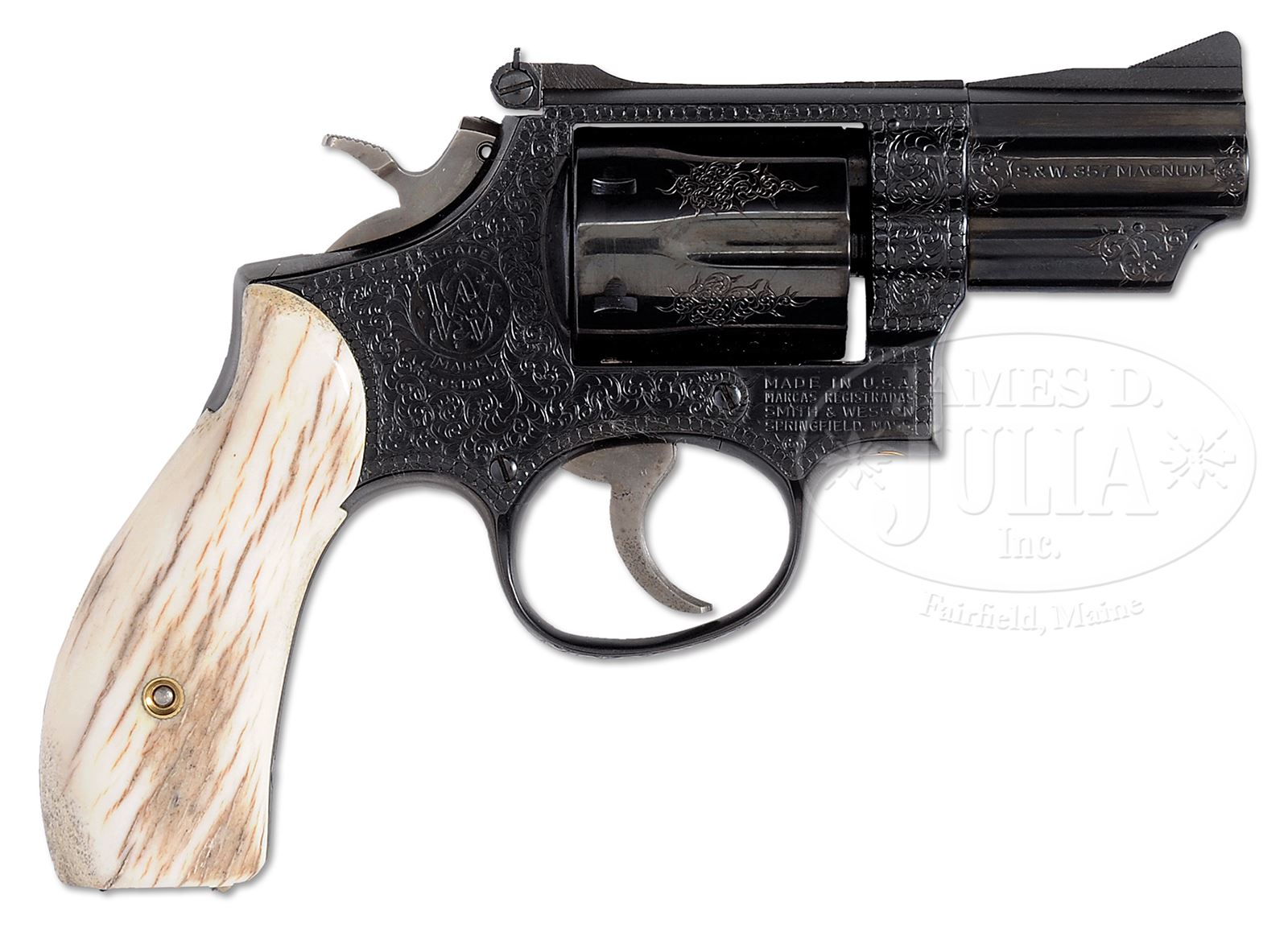 *ENGRAVED SMITH & WESSON MODEL 19 REVOLVER.SN 6K11965. Cal. .357 mag. 2-1/2″ bbl, blue finish. Bone grips. PROVENANCE: Larry Baer Estate Collection. CONDITION: Very fine, revolver retains 98% blue as refinished after engraving. Hammer and trigger are polished bright. Adjustable rear sight, ramp front sight. Engraving is nearly full coverage on the frame and 50% coverage on the bbl, pattern is a tight scroll with bead bordering, very well executed. There is a gold spider inlaid into the frame in front of the trigger guard. Bone grips are fine showing some age checking. Very nice custom .357 revolver. 49428-35 TEP (2,000-3,000) – Lot 1346