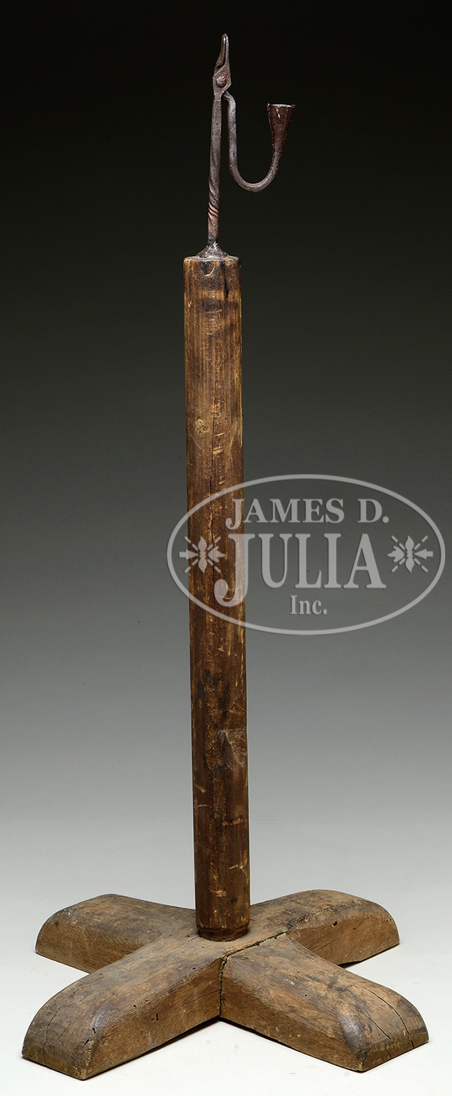 FORGED IRON RUSH LIGHT WITH WOODEN X-BASE STAND.18th century, New England. Iron, pine, ash. Great early form, the square, twisted rush light shaft, with rush pincer and down-swept, rounded counterbalance arm with conical, seamed snuffer/candlecup. The round, carved pine post mortise joined to ash X-base. SIZE: 31-1/2″ t. overall. CONDITION: Very good original condition, attic patina, the rush light with worn original black paint and light oxidation. 9-96589 (800-1,200) – Lot 1347