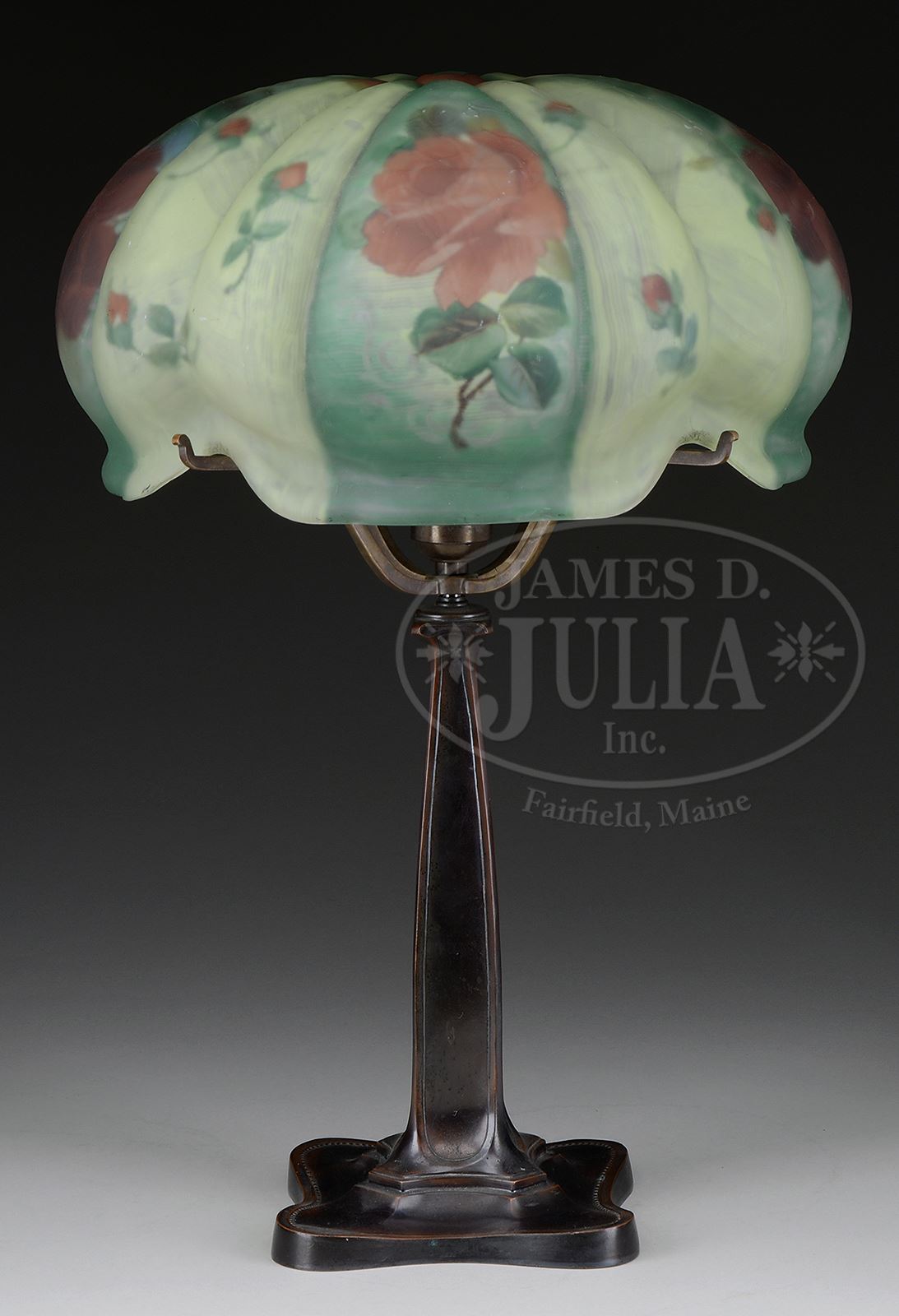 PAIRPOINT ROSE TABLE LAMP.Pairpoint table lamp has melon ribbed shade with reverse painted decoration of pink and red roses and rosebuds surrounding the shade against lightly striated green background. Signed on outer lip “The Pairpoint Corp”. Shade rests on original Pairpoint base with squared foot and stem leading to four arm spider and single socket. Base is finished in rich bronze tone. Signed on underside “Pairpoint MFG Co.” along with Pairpoint logo and “B3040”. SIZE: Shade is 14″ dia. Lamp is 21-1/2″ t. PROVENANCE: From the Unreserved Collection of Dr. & Mrs. Brian Bojesen. CONDITION: Shade is very good to excellent. Base is very good with some minor wear to finish. Re-wired with appropriate cloth cord. 50361-18 (1,000-1,500) – Lot 1347