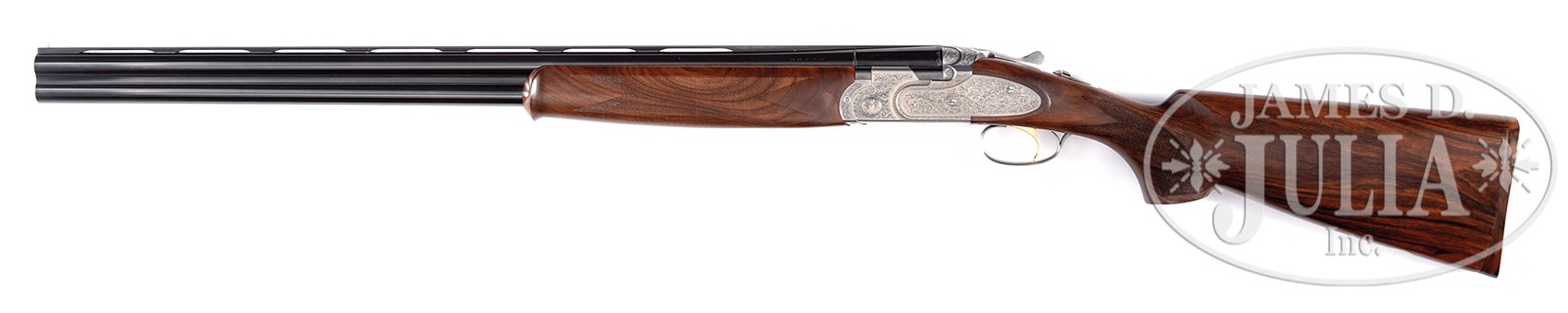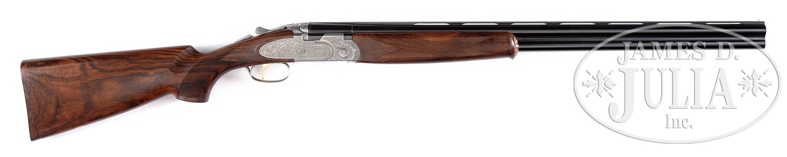 SN R46287S. Cal. 12 ga. 28″ bbl of Excelsior high strength alloyed steel. 1/4″ vent rib, 3″ chambers, fixed IC & MOD chokes. Silver finished sideplated action with full coverage floral engraving signed by “Bottega C. Giovanelli”. Gold plated single selective trigger with auto ejectors. Schnable tipped forearm and pistol grip stock of fancy thin shell walnut with hand checkering and nameplate in toeline. LOP: 14-3/8″ over checkered wooden buttplate. Housed in Beretta molded hard case with blue overbox containing instruction manual with warranty and associated papers, optional plastic buttplate, sling swivels, fabric gun covers and oil. PROVENANCE: Remarkable William Larkin Moore Private Estate Collection of Fine Sporting Arms. CONDITION: Nearly new condition retaining virtually all of its orig finish. 50595-67 DS (2,750-4,250) – Lot 1347