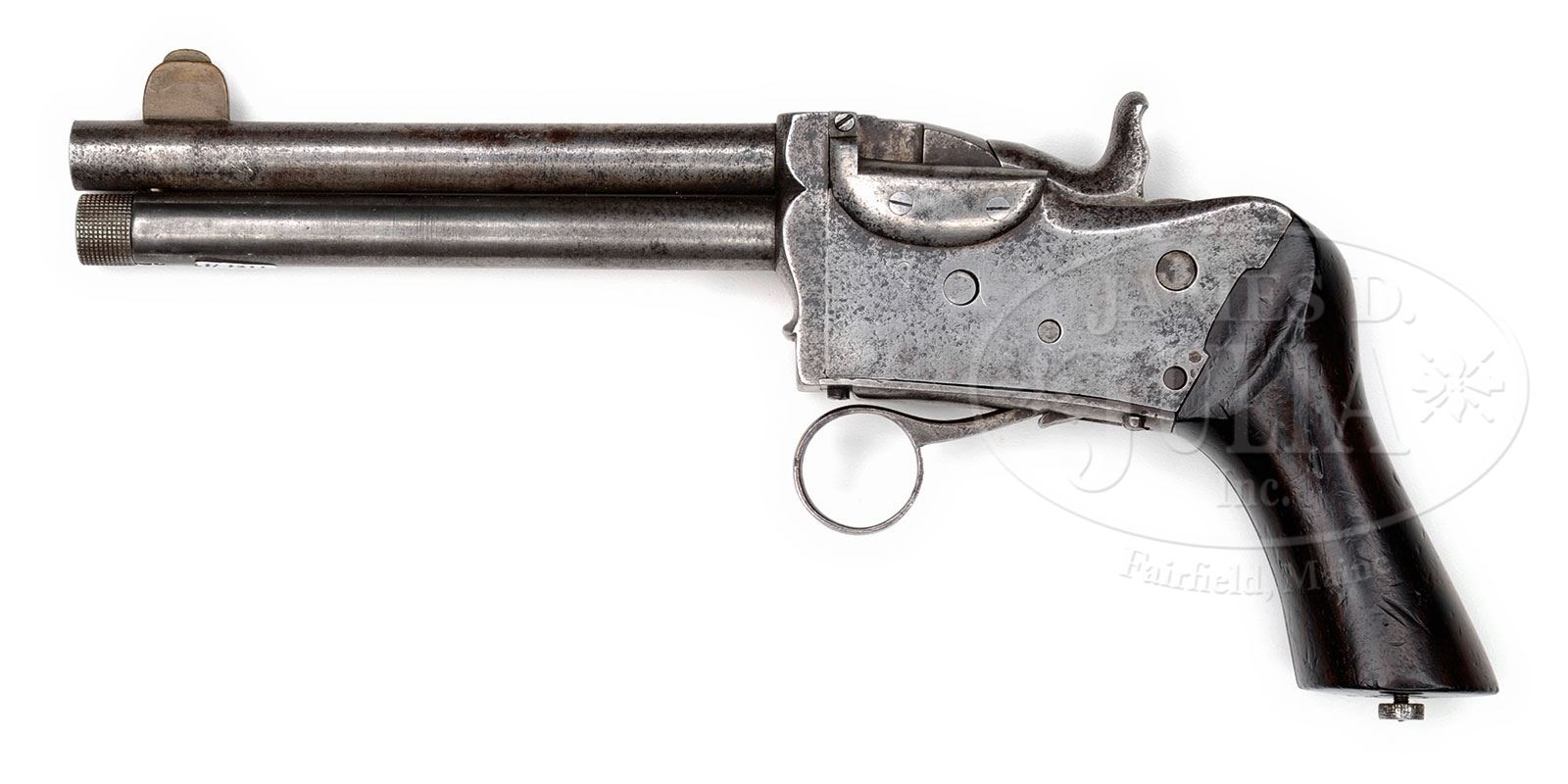 Estimate should be $4,000-$6,000. VERY UNUSUAL BERGER REPEATING PISTOL.SN 33. Cal. 7.5mm. The Berger repeating pistol, made in France, has a unique mechanism that involves a double set of hammers. Gun has a 5-1/4″ bbl and an overall length of 9-3/4″. A large, fixed front sight, made of copper, sits on the bbl overriding a tubular magazine that loads from the front. The only marking on this pistol is an oval logo on the front of the frame “MARIUS BERGER/33/BREVETTE S.G.D.G.” The finger loop trigger is well tensioned and the grips are of smooth, varnished wood. Pulling the trigger actuates the cartridge elevator while cocking both hammers. The forward hammer/breechblock, that carries the firing pin, falls first. The rearmost hammer immediately follows, striking the now-protruding firing pin. Relaxing the finger loop allows the trigger to spring back into position. PROVENANCE: Ex-Visser Collection; Collection of Dr. Geoffrey Sturgess. CONDITION: Very little finish remains on this largely gray-brown gun with shallow etching on receiver and a replaced firing pin. Original grips, darkened from use, have superficial handling dings but no significant chips and no splits. Surprisingly bright bore with strong rifling and only mild frosting. Perfect manual function. An exceeding unusual repeater with double falling hammers for a single ignition! 4-52433 LMA39 (2,500-4,000) – Lot 1348