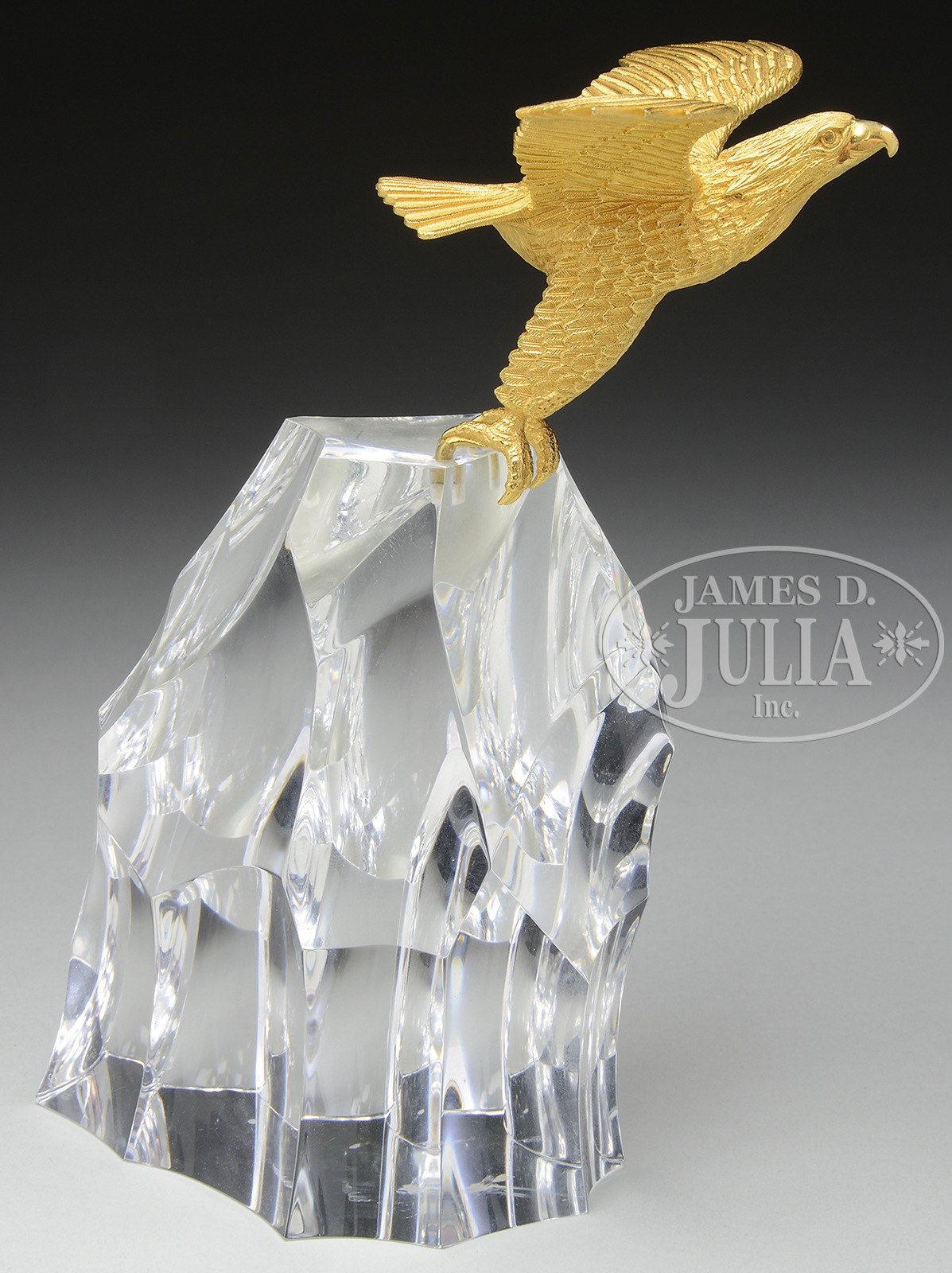 STEUBEN “EAGLE ON ROCK” SCULPTURE WITH 18KT GOLD EAGLE.Retired Steuben crystal and gold sculpture features an 18kt yellow gold eagle launching into flight from a sculpted clear crystal rock. The sculpture was designed by James Houston and first introduced in 1991 and is a limited edition of 100. Crystal piece is signed with lightly engraved signature “Steuben”. Sculpture comes complete with original red leather presentation box as well as a red leather and velvet presentation folder with description of the piece as well as a black and white photo. Eagle weighs 268 grams. SIZE: 7-1/2″ t. CONDITION: There are some very minor flea bites to mounting holes on top of the crystal rock where eagle stands. These are concealed when eagle is in place. Otherwise very good to excellent. One leather closure strap on presentation box is torn. 5-67870 (6,000-9,000) – Lot 1351