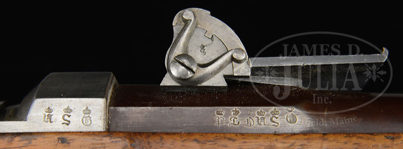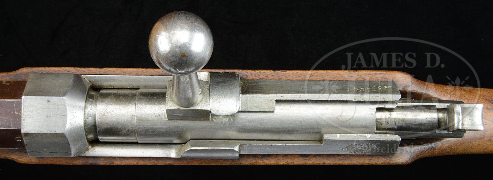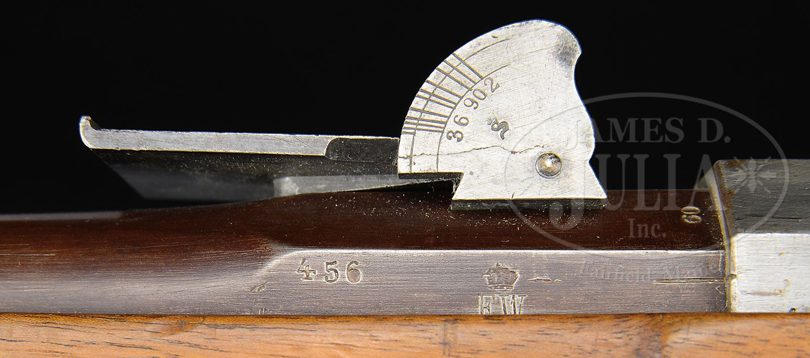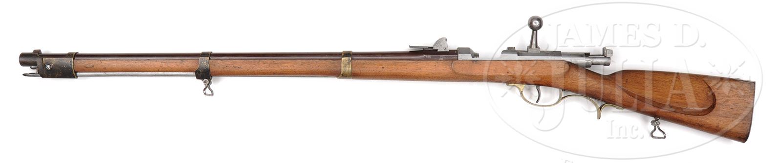 VERY RARE MOD54 ZUNDNADELBUCHSE PIKENBUCHSE NEEDLEGUN WITH HESSIAN QUADRANT REAR SIGHT.SN 456. Cal. 14mm. This rifle is complete & all-matching down to the screwheads, including a built-in 29-1/2″ unnumbered spike bayonet which is reminiscient of the spike bayonet on the US M1888 Springfield Trapdoor rifle. SN “456” is marked on the bbl, receiver, bolt, buttplate, trigger guard assembly, bbl bands, rear sight and all screwheads. Bbl length is 29″. This rifle was made at Spandau and bears issue dates 1856 & 1857. The stock is made of walnut with Crown/FW cartouches that are clear and fairly crisp, although the 3 cartouches near the lower swing swivel are light. Rifle is unit marked on the buttplate tang “5.J.2.92”. The receiver and bolt are in the white, as are the bayonet & swivels. The bbl has been browned. Trigger guard & bbl bands are brass. PROVENANCE: Ex Visser collection. Collection of Dr. Geoffrey Sturgess. CONDITION: This rifle is in extraordinary condition, both in terms of the quality of wood, as well as metal finish and consistency of its matching numbers. Metal parts retain approx 85% finish. Stock has very few dings & dents; is overall smooth with a pleasing honey brown coloration. Bore is shiny & sharp; rifling at the crown is crisp and well cared for. Mechanics are clean & crisp, and show evidence of recent cleaning. Bbl bands are blackened. Bayonet is complete & functional. 4-53128 JJW16 (4,000-6,000) – Lot 1351