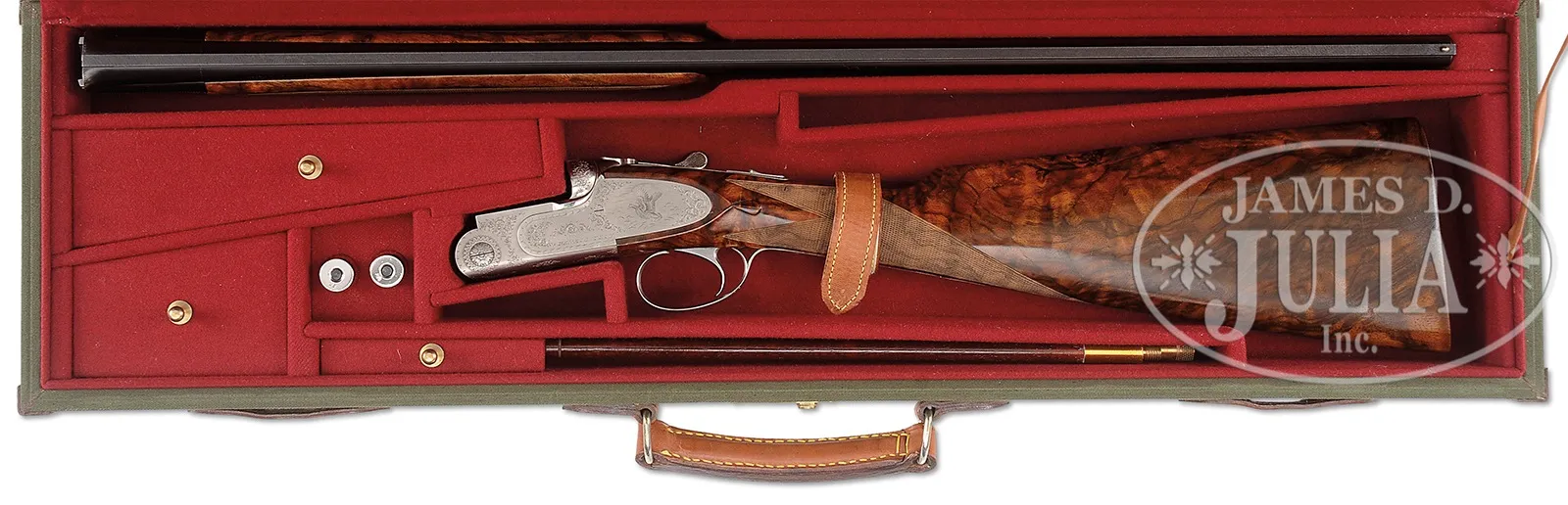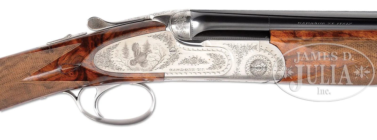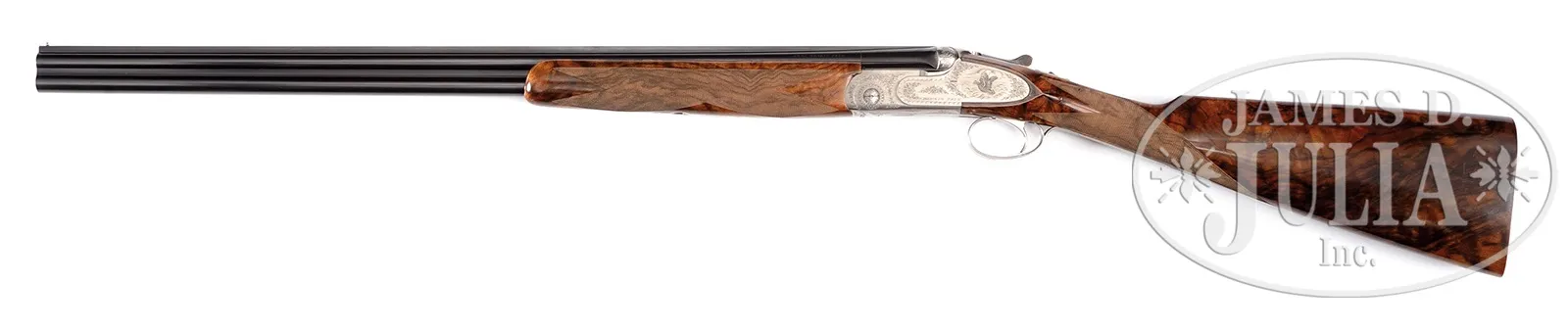 *RENATO TELO BEST CASED OVER/UNDER ITALIAN SHOTGUN.SN 350. Cal. 28 ga. 27″ bbl with hand matted solid rib with fixed MOD & FULL chokes. Chambers are 2-3/4″ as marked. Silver finished side-plated ejector action with single non-selective trigger. Fine Bulino hand engraving featuring flying quail on side plates with a flying woodcock on floor plate surrounded by arabesque scroll signed by master engraver C. Cremini. Trim forearm with straight hand stock of exhibition quality walnut with hand checkering. LOP: 14-7/16″ to checkered butt. Drop at comb: 1-1/2″. drop at heel: 2-1/8″. Weight: 5 lb, 1.2 oz. Includes canvas luggage case with red velour fitted interior with makers label. Case contains cleaning rod, snap caps and key. CONDITION: Bbl has very good blue showing a few small handling marks. Action has very good silver finish. Glossed finished stocks show scattered scratches. Bright bores having some plastic fouling forward of chambers. 50456-1 DS (7,500-12,500) – Lot 1351