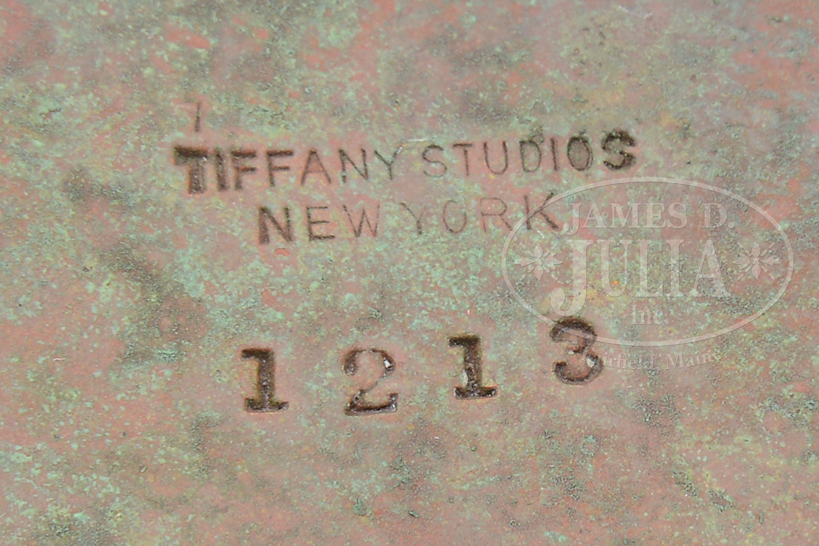 TIFFANY STUDIOS BRONZE AND FAVRILE GLASS CANDLESTICK.Tiffany Studios candlestick has circular foot of organic form with slender stem, leading to the gold Favrile glass ball candle cup. Candlestick is finished in a rich brown patina and is signed on the underside “Tiffany Studios New York 1213”. SIZE: 16-3/4″ t. PROVENANCE: From the Unreserved Estate of Lynda Cunningham. CONDITION: Very good to excellent with some minor wear and discoloration to patina. 51361-209 (800-1,200) – Lot 1352