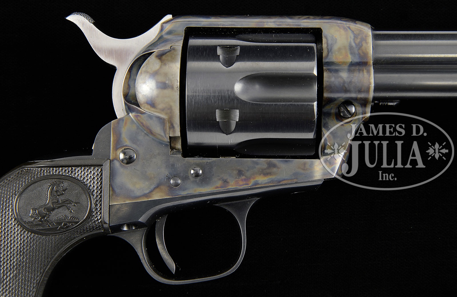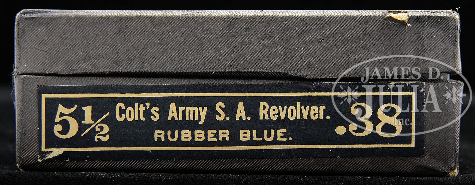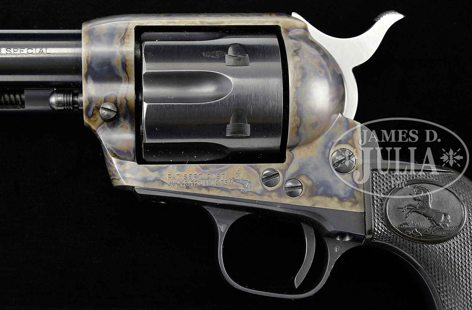 *VERY LATE PRE-WWII COLT SINGLE ACTION ARMY REVOLVER WITH ORIGINAL BOX.SN 357652. Cal. 38 Spcl. Blue & color case hardened with 5-1/2″ bbl, full thick front sight and 1-line block letter address with model & caliber marking on left side. Left side of frame has 2-line 3-patent dates and Rampant Colt. Mounted with Rampant Colt hard rubber grips matching numbered to this revolver. SN was observed on bottom of the frame and right side of front & back straps under the grip. Rear face of cyl has the last two digits of matching SN. Accompanied by its orig, matching numbered, hinged lid, dark burgundy cardboard box with black & white end label. Box also contains its orig target & a wire handle cleaning brush. Also accompanied by a “Colt Interoffice Correspondence” dated Sept. 21, 1964 over the signature of D.E. Shorb. This correspondence details the sale of five Colt revolvers, including this one, to Mr. Herb Glass, along with a consecutive serial numbered Single Action Army, also in 38 Special, being sold elsewhere in this auction. Additionally accompanied by a copy of a Colt company invoice dated 10-8-64 transferring those five revolvers, including this one, to Mr. Glass. Most publications show that there were 357,859 Single Action Army revolvers assigned SNs prior to WWII. This one, being one of the very last, is probably one of the about 300 revolvers assembled after WWII using pre-war parts. The date of the invoice lends credence to this thought. PROVENANCE: Robert H. Haskell, III Estate Collection. CONDITION: Extremely fine plus, all matching, pristine, new & unfired. Retains all of its brilliant orig finish. Appears to be new & unfired and unturned. Box is equally crisp & new with only a couple of scuffed corners. 4-50231 JR214 (4,000-6,000) – Lot 1353