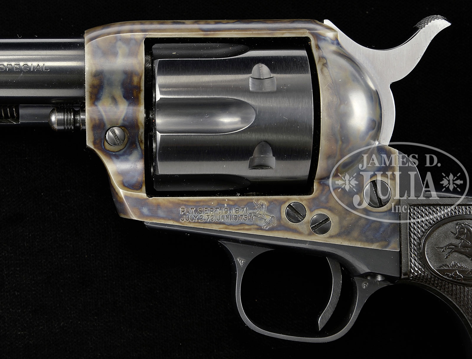 *VERY LATE PRE-WWII COLT SINGLE ACTION ARMY REVOLVER WITH ORIGINAL BOX.SN 357653. Cal. 38 Spcl. Blue & color case hardened with 5-1/2″ bbl, full thick front sight and 1-line block letter address with model & caliber marking on left side. Left side of frame has 2-line 3-patent dates and Rampant Colt. Mounted with Rampant Colt hard rubber grips matching numbered to this revolver. SN was observed on bottom of the frame and right side of front & back straps under the grip. Rear face of cyl has the last two digits of matching SN. Accompanied by its orig, matching numbered, hinged lid, dark burgundy cardboard box with black & white end label. Box also contains its orig target & a wire handle cleaning brush. Also accompanied by a “Colt Interoffice Correspondence” dated Sept. 21, 1964 over the signature of D.E. Shorb. This correspondence details the sale of five Colt revolvers, including this one, to Mr. Herb Glass, along with a consecutive serial numbered Single Action Army, also in 38 Special, being sold elsewhere in this auction. Additionally accompanied by a copy of a Colt company invoice dated 10-8-64 transferring those five revolvers, including this one, to Mr. Glass. Most publications show that there were 357,859 Single Action Army revolvers assigned SNs prior to WWII. This one, being one of the very last, is probably one of the about 300 revolvers assembled after WWII using pre-war parts. The date of the invoice lends credence to this thought. PROVENANCE: Robert H. Haskell, III Estate Collection. CONDITION: Extremely fine plus, all matching, pristine, new & unfired. Retains all of its brilliant orig finish. Appears to be new & unfired and unturned. Box is equally crisp & new with only a couple of scuffed corners. 4-50229 (5,000-8,000) – Lot 1354