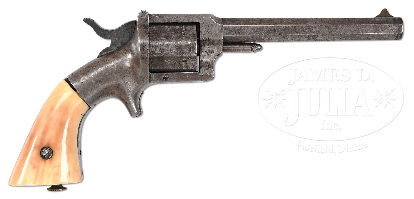 INSCRIBED CIVIL WAR POND REVOLVER WITH CARVED “ZOUAVE” IVORY GRIPS.SN 639/739. 32 Cal. RF. This is a nice example of an early war 5″ bbl Pond Revolver made in Worcester, Massachusetts with the rare addition of carved walrus ivory grips. Left grip is carved in high relief of a Zouave soldier. Inscribed on backstrap “CAPT. HOLDEN “34TH REGT. CO. I MASS/V”. Capt. Holden was a 42 year old dentist from Ware, Massachusetts who enlisted August 6, 1862 and resigned his commission November 8, 1862. Capt. Holden was quite prominent in the GAR after the Civil War until his death in Worcester August 25, 1923, age 103 years old. PROVENANCE: Norm Flayderman Estate Collection. CONDITION: 32 Cal. RF. Good to very good overall. Gun appears complete and orig though SNs on arbor and bbl are 739 and remainder of gun SNs is 639. The carved ivory stocks are not numbered but exhibit good patina and color overall. Top bbl flap correctly marked “L.W. POND WORCESTER, MASS/PATd JULY 10, 1860”. Gun retains screwed in tool and butt. Mechanically gun functions well with discernible rifling in pitted bore. 4-54437 JS41 (3,000-4,000) – Lot 1355