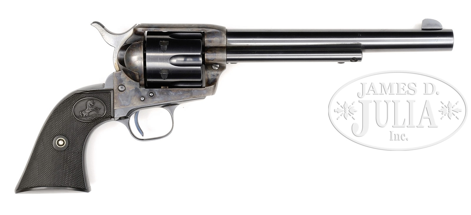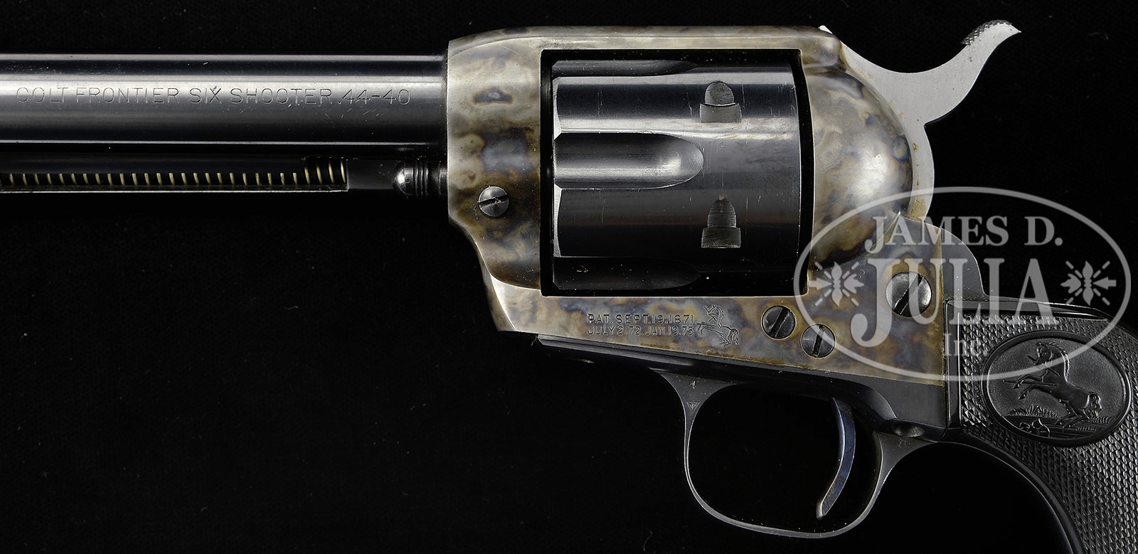 *LATE PRE-WWII COLT FRONTIER SIX SHOOTER SINGLE ACTION ARMY REVOLVER.SN 355944. Cal. 44 WCF (44-40). Blue & color case hardened with 7-1/2″ bbl, slightly reduced thick front sight and 1-line block letter address and “COLT FRONTIER SIX SHOOTER 44-40” roll marked on left side. Left side of frame has 2-line 3-patent dates and Rampant Colt. Mounted with Rampant Colt hard rubber grips matching numbered to this revolver. SN was observed on bottom of the frame and right sides of front & back straps. Rear face of cyl has last two digits of matching SN. PROVENANCE: Robert H. Haskell, III Estate Collection. CONDITION: Extremely fine, all matching. Overall retains 99% orig factory finish with crisp bright blues and mostly brilliant case colors, lightly faded on top strap & loading gate. Grips show faint diamond point wear. Mechanics are crisp, brilliant shiny bore. May have been fired but if so, very little. 4-50227 (4,000-6,000) – Lot 1356
