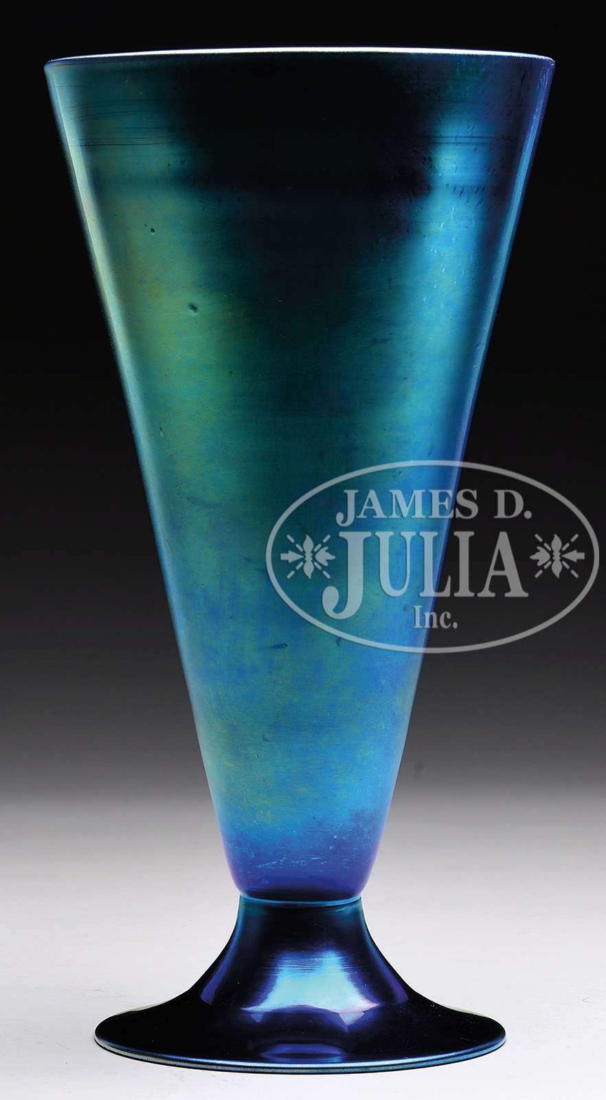 STEUBEN BLUE AURENE VASE.Steuben vase shape #6034 has bright blue aurene finish shading to platinum at the top. Vase is signed on the underside with engraved signature “Steuben Aurene 6034”. SIZE: 12″ t. CONDITION: Very good to excellent. 5-68810 (2,000-2,200) – Lot 1356