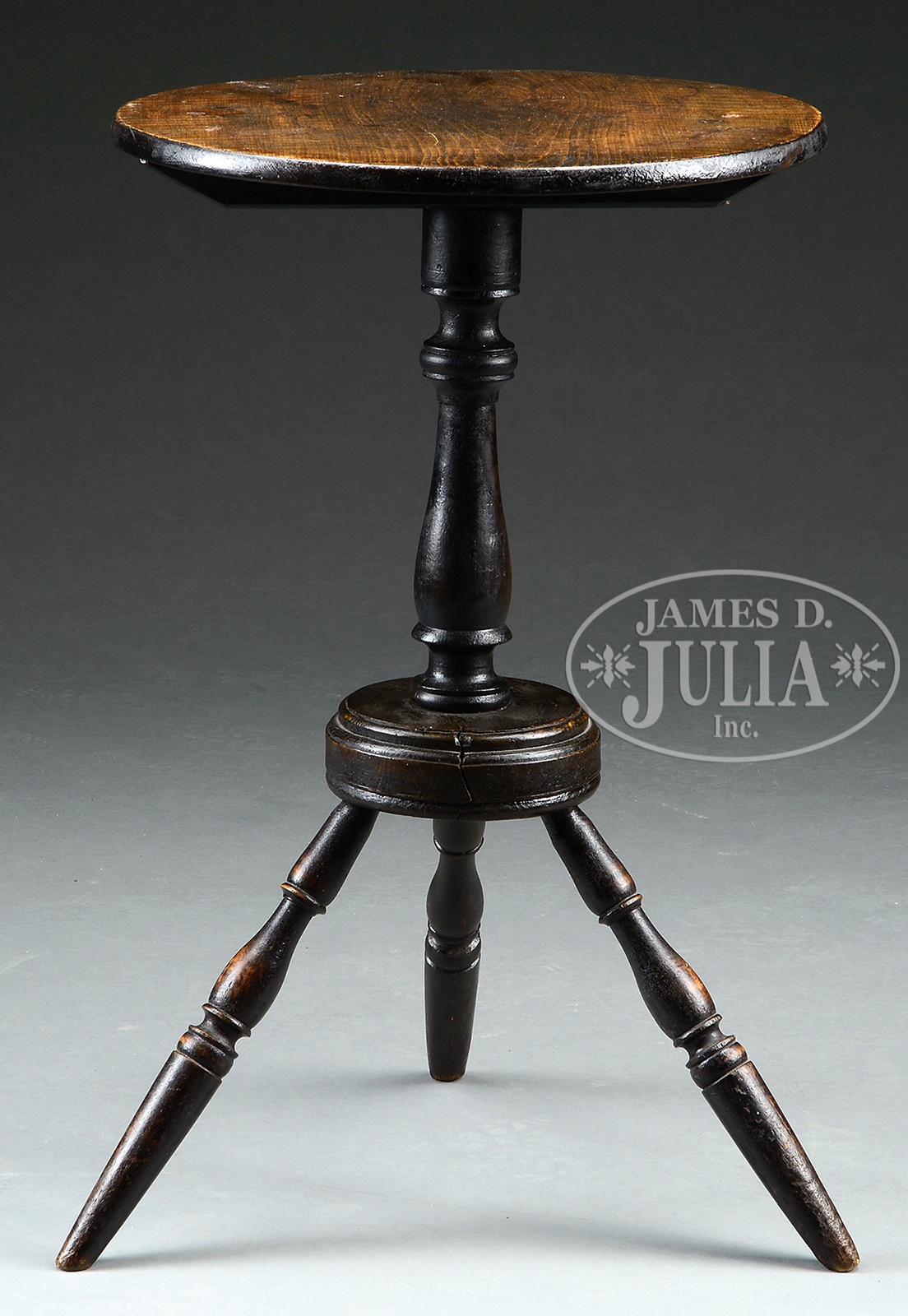 SUPERB, VERY RARE & IMPORTANT WINDSOR TRIPOD CANDLESTAND.Circa late 18th century, CT. Tiger maple, chestnut, maple. Early crusty varnished surface over original black paint. The scrubbed top of boldly figured tiger maple with beveled edge, affixed to thick, beveled end, chamfered edge maple cleat, turned maple vase, ring & reel column, mortise joined to ring turned chestnut circular platform, and well turned vase, ring & reel raked legs with long tapering feet. SIZE: Top 17-1/2″ x 18″ x 28″ t. CONDITION: Very good condition, early chip loss and age drying crack to circular platform, crack in cleat glue repaired, cleat screws in-use old replacements, minor age appropriate abrasions. 9-96598 (2,000-5,000) – Lot 1358