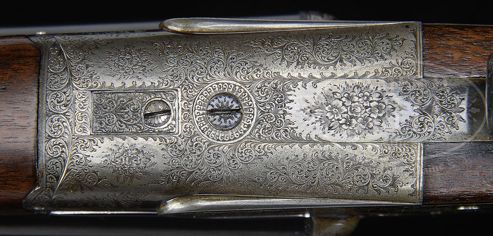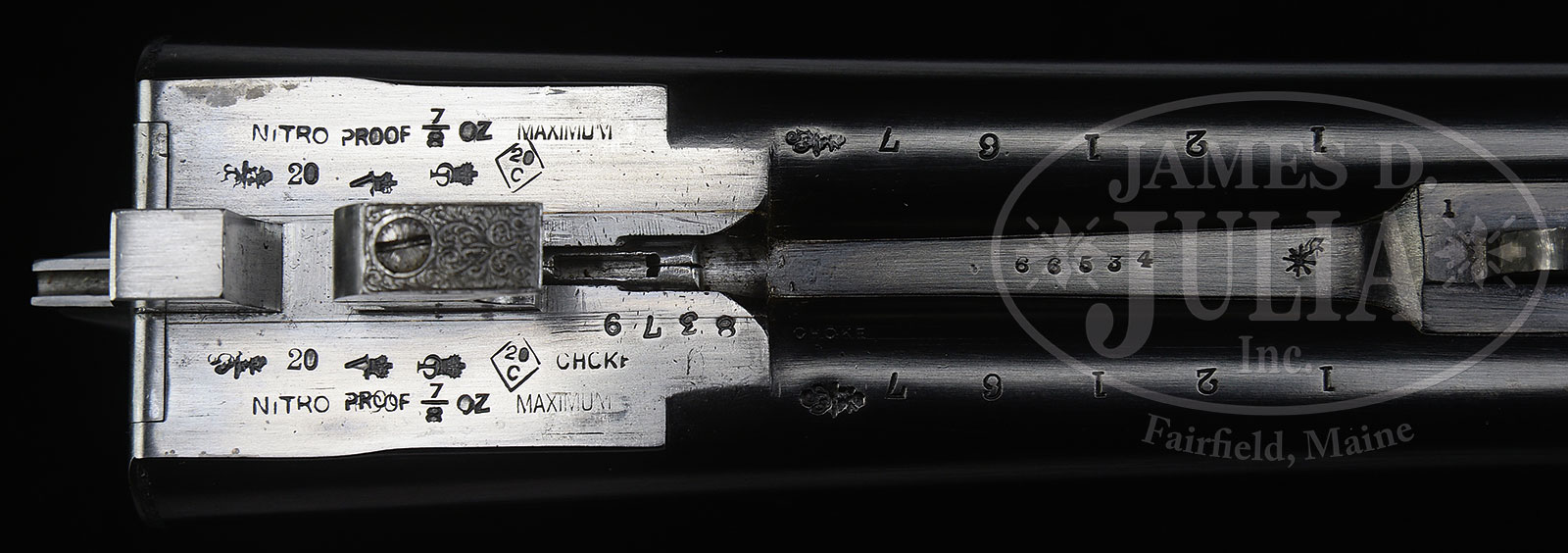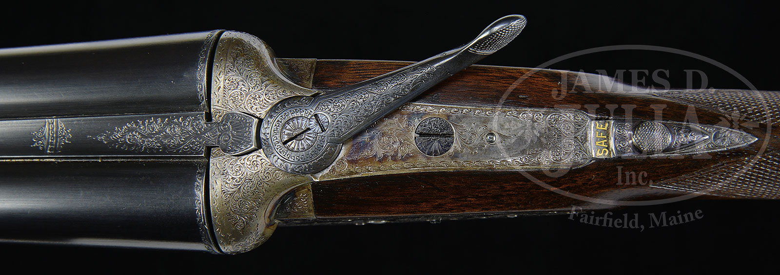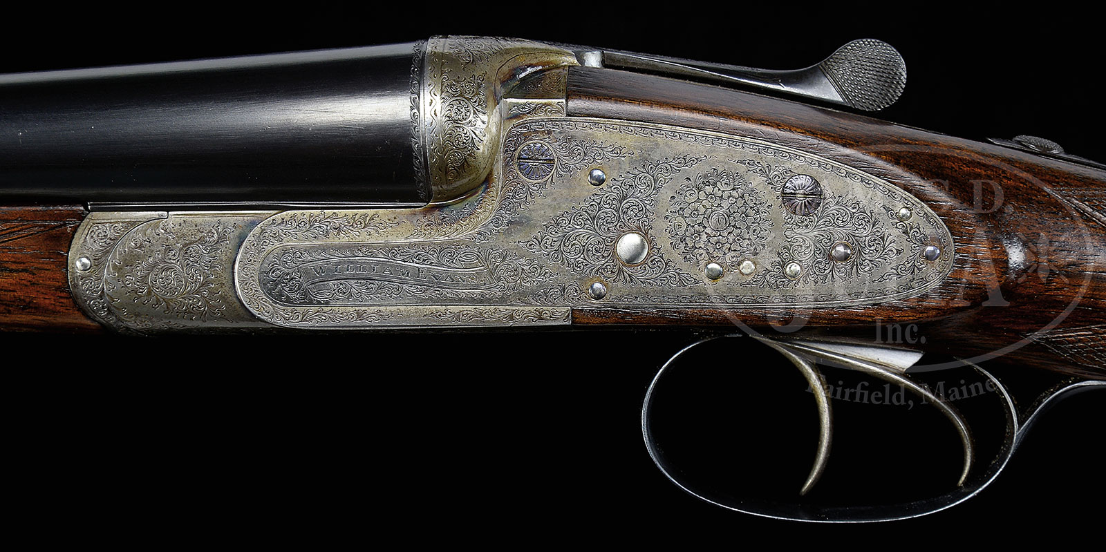 *20 GAUGE WILLIAM EVANS SIDELOCK EJECTOR LIGHT GAME SHOTGUN WITH SLIPCASE.SN 12167. (ca 1920) Cal. 20 ga. 2-1/2″ Chambers. 28″ Dovetailed bbls are engraved “William Evans, 63, Pall Mall, St James’s London.” on swamped narrow game rib with dolls head extension. Bbl flats are stamped with London nitro proofs for 2-1/2″ chambers. Bbls have provisional proofs and SNs. Very small screw grip back sidelock action features automatic safety (SAFE inlaid in gold), pivoting third fastener, bushed strikers, and dbl triggers. Action is engraved with 80% coverage very well cut varying sized scroll with some rose bouquet highlights. “William Evans” is in scroll terminated riband on each side of action. Blued trigger guard with matching engraving has SN on short tang. Broadly streaked European walnut straight grip buttstock measures 14-3/8″ over checkered wood butt, and has very well done flat top point pattern checkering with mullered borders at grip. Matching splinter ejector forend has Anson release. Bore diameter: left -.623, right – .624. Bore restrictions: left – .016 (mod), right – .010 (IC). Wall thickness: left – .029, right – .024. Drop at heel: 2-5/16″, drop at comb: 1-5/16″. Neutral cast. Weight: 5 lbs. 4 oz. LOP: 14-3/8″. Gun is accompanied by a green canvas takedown slipcase with leather trim by L. L. Bean. CONDITION: Very fine, as partially refinished. Bbls retain nearly all of a good quality rust re-blue. Action and locks retain 30 – 40% orig case hardening color, strong where protected. Top lever and trigger guard re-blued, and retain nearly all of that blue. Stocks lightly refinished and retain nearly all of that oil finish, checkering has not been re-cut. Bores are excellent. Action is tight. Bbls are on face. Ejectors are in time. Case is excellent. A great handling lightweight gun that measures quite well. 51815-1 MGM172 (10,000-15,000) C&R – Lot 1359