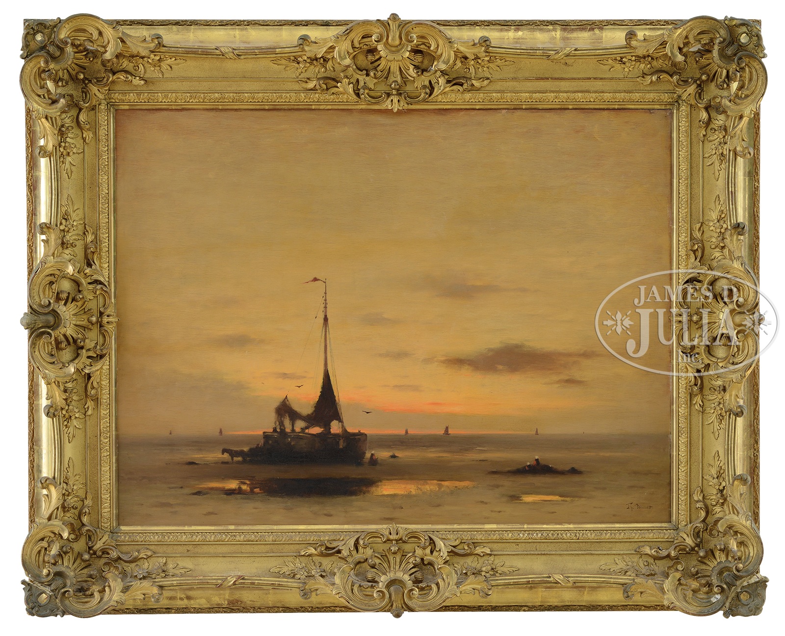 CONTINENTAL SCHOOL (19th century) LOW TIDE AT SUNSET.Oil on panel Housed in an impressive ornately carved period gilt and gesso wood frame Signed lower right “Jy. W…dt” SIZE: 31″ x 41″. Overall: 44″ x 55″ CONDITION: Paint surface has horizontal cracking, frame abrasion along edges, frame has break to bottom two corners, otherwise normal wear for its age, some inpainting to craquelure boat 49054-13 (500-1,000) – Lot 1360