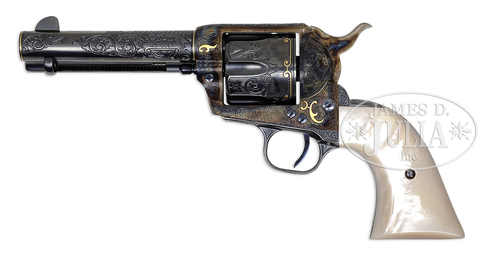 SN 2563AM. Cal. 45 Colt. Blue & color case hardened with 4-3/4″ bbl, relocated front sight and 2-line address with cal marking on left side. Left side of frame has 2-line, 3-patnet dates and Rampant Colt. Left side of front & back straps, under the grip, has matching serial number. Right side of front & back straps have the assembly number “264”. Front face of cyl around the bushing hole has last three digits of matching serial number. Bottom of bbl, under ejector housing, is marked “B.G.L.-11/01”, the initials of master engraver, Ben G. Lane and what is apparently the date he engraved this revolver. Mounted with an unusual, modern, 1-pc pearl grip made to resemble an orig Colt 1-pc grip, consisting of 2 slabs of pearl attached to a wood spacer block. This grip additionally has a screw in the left side simply threaded into the wood block and has a slightly raised carved Mexican eagle on the right side. Revolver is wonderfully engraved by Mr. Lane to duplicate a Single Action Revolver. Formerly owned by Sheriff Jefferson Farr of Walsonburg, CO, serial number 256058, which appeared on the cover of the fall 1995 issue of The Texas Gun Collector, the publication of the Texas Gun Collectors Association. Pages 16-17 had a short article from the editor about this revolver with three additional photographs. A note with this revolver indicates that Mr. Lane was commissioned to create this copy from a revolver with 7-1/2″ bbl. Mr. Lane reduced the bbl to its current length, relocated the front sight and engraved it. The grip was created by Raj Singh and it was finished by Doug Turnbull Restorations. This revolver is engraved in Cuno Helfricht style with full coverage, foliate arabesque patterns on the frame, shell patterns on the recoil shield and loading gate with foliate arabesque patterns extending up each side of the bbl and at the muzzle. It also has geometric patterns on top of the bbl. Both sides of the frame are inlaid with flush gold arabesque patterns and there is a narrow gold band around each end of the bbl. Backstrap is engraved to match with an elaborate fan pattern at the top that also has flush gold wire worked into the pattern. Cyl is engraved to match with gold wire decoration around the rear edge. Trigger plate is engraved “BL” intertwined, the initials of the engraver. Accompanied by a copy of the referenced magazine and a target shot by this revolver. CONDITION: Extremely fine plus. Has been fired, as noted. Overall retains virtually all of its crisp factory style finish with bright blues and brilliant case colors; grip is sound showing great fire. Mechanics are crisp; brilliant shiny bore. 4-50378 JR464 (6,500-9,500) – Lot 1362