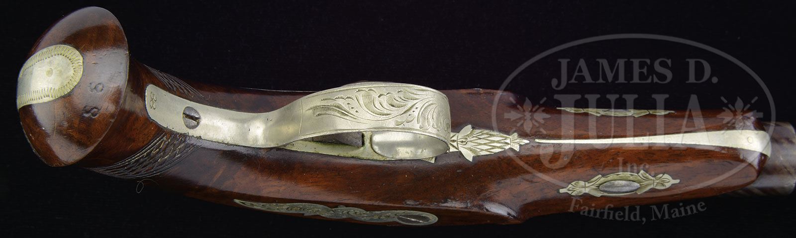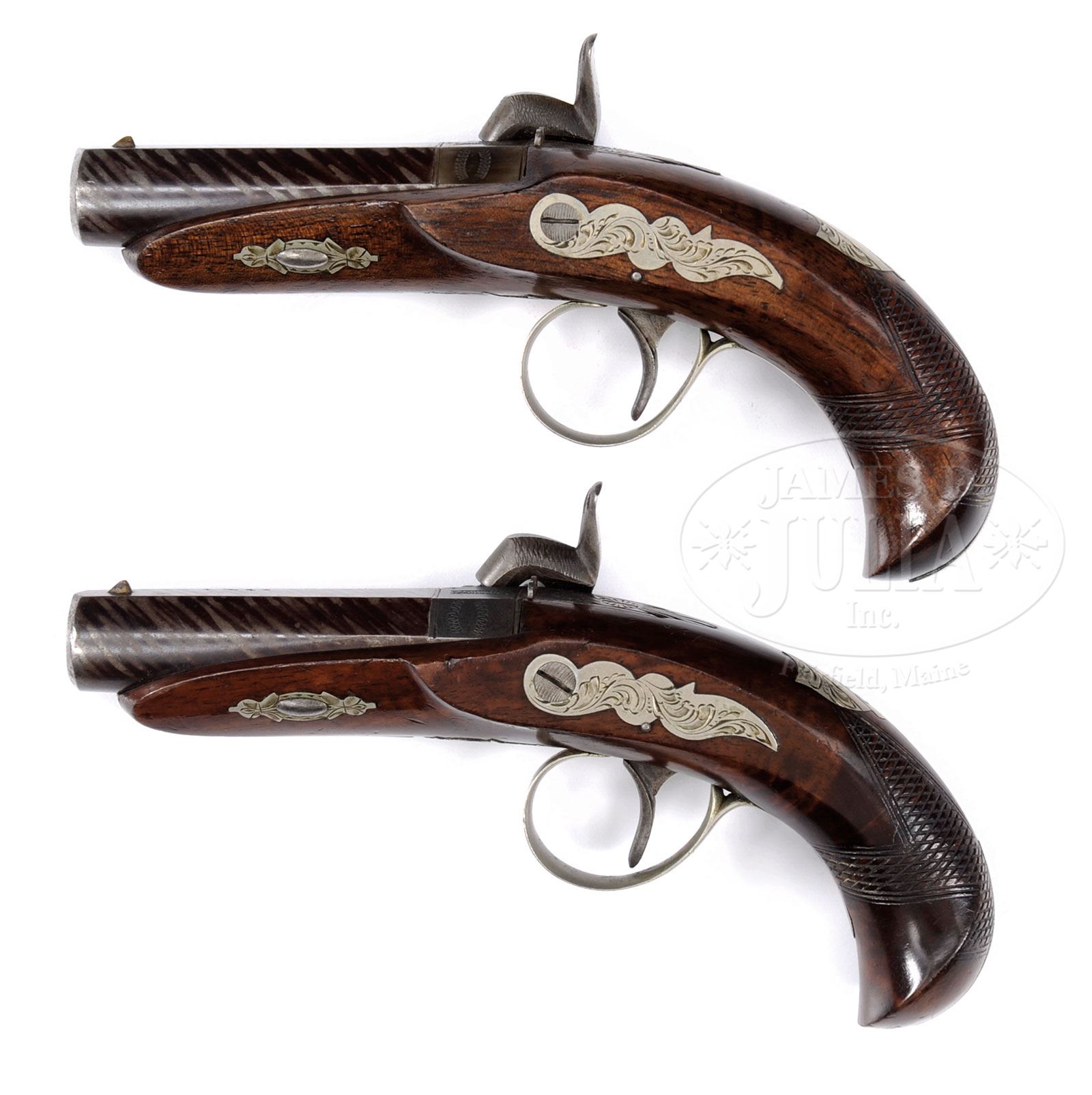 RARE & EXQUISITE PAIR OF PHILADELPHIA DERINGER PISTOLS MARKED “J DERINGER PHILADELPHIA”.Henry Deringer’s name was well known in America as a maker of the finest, small single shot pistols. Henry Schlotterbeck and his brother Charles worked for Deringer but left in 1859 starting their own business. Schlotterbeck made pistols in Henry Deringer’s design for 3 years from 1860-1863. Schlotterbeck hired and took into partnership a tailor named John Deringer, so now Schlotterbeck’s pistols could legally be marked “J. DERINGER PHILADELPHIA”? Henry Deringer sued Schlotterbeck for infringing on his name. In the 1863 trial Schlotterbeck stated “I left Deringer in the year 1859 and commenced to make fine, finished pistols in 1860. They were a far finer quality than Deringer’s….” According to Doug Eberhart in his text co-written by R. L. Wilson The Deringer in America “The flagrant counterfeiting was justified… Charles Schlotterbeck had showed Henry Deringer a pair of pistols he had made in the Deringer shop. Deringer gave permission to have his name stamped on them, allowing that he was proud to have his name on such fine workmanship.” During the trial in 1863 it became known that Schlotterbeck’s quality was exceptional, maybe better then Henry Deringer so a new firm marking soon appeared on Deringer style pistols “SLOTTER & CO”. This particular pair of pistols measure about 6-1/4″ overall with 3″ bbls including breeches that are German silver mounted, case colored locks and breeches and striped brown bbls. This pair is in superb condition, retaining almost all orig bright striping and are near perfect in almost every regard. PROVENANCE: Norm Flayderman Estate Collection. CONDITION: Extremely fine. Bbls retain bright brown striping which appears over 95% complete with crisp, fine bores, with 6 lands and grooves which are crisp and bright. One gun retaining most all its orig blue in bore and the other 60-70%. Breeches retain strong, muted case colors with locks smooth and blue/silver. German silver escutcheons, trigger guard and thumb plates are engraved in-suite to locks, hammers and tangs. Breeches and locks are crisply marked in small dies “J.DERINGER/PHILADELA”. Right rear bbl flats are also marked WART STEEL. Guns retain virtually all their orig bright varnished finished with wear at high spots. 4-54451 JS23 (4,000-6,000) – Lot 1363