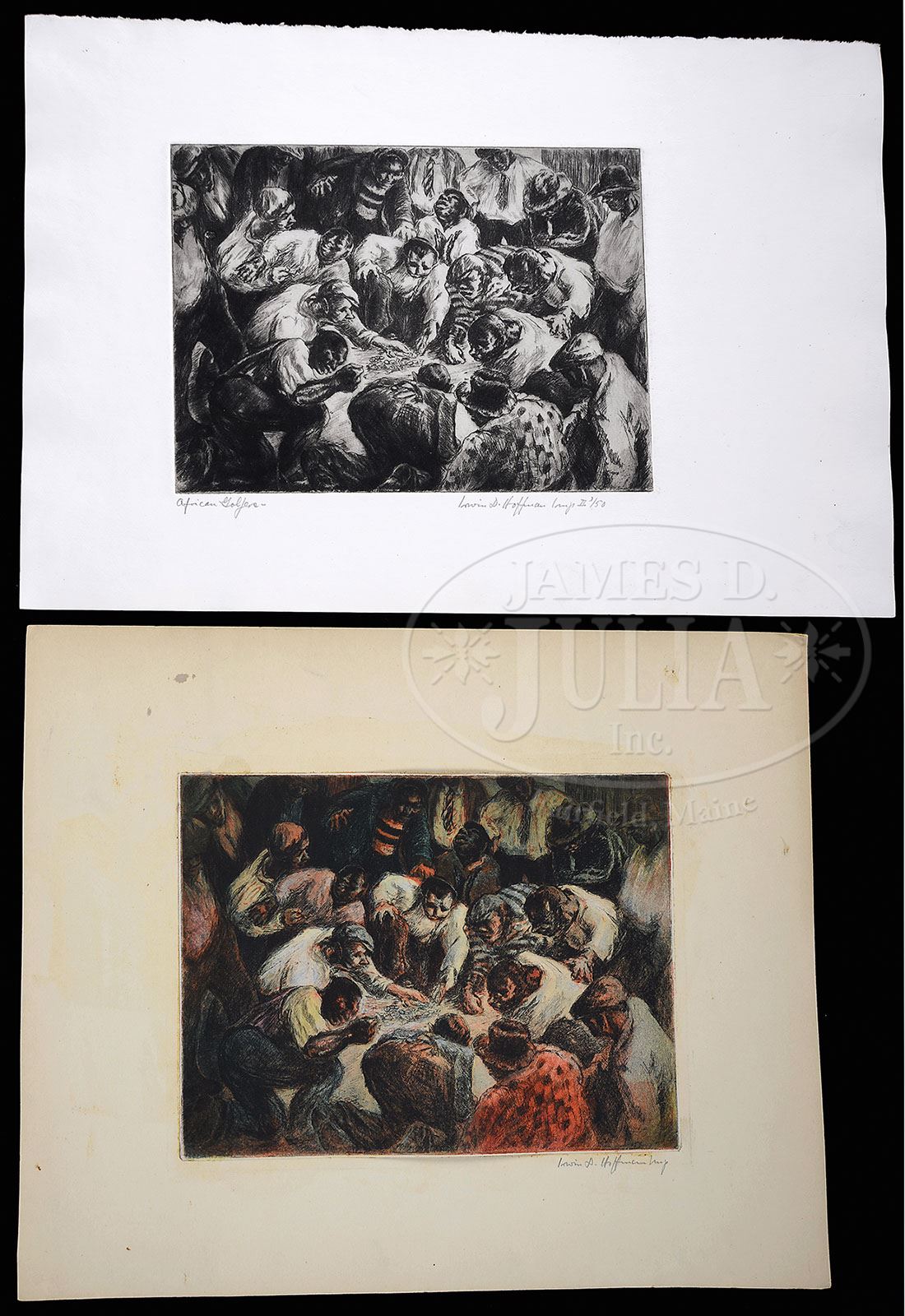 IRWIN D. HOFFMAN (American, 1901-1989) TEN MIXED ETHNIC. Etchings on paper Unframed 1) African Golfers (hand tinted) Signed in pencil lower lower right. 2) The Cultivators Signed lower right and dated indistinctly in plate, charcoal titled and signed. 3) African Golfers Signed lower right in plate, pencil titled, signed and numbered 3/50. 4) Mexican Madonna Signed lower right and dated 1944 in plate, pencil titled and signed. 5) Puerto Rican Folk Song Titled and signed in pencil. 6) Lace Makers – Puerto Rico Signed lower right and dated 1944 in plate, pencil titled and signed. 7) Night Market – Mexico Titled and signed in pencil. 8) Wash Day – 2nd Slate? Titled and signed in pencil. 9) El Teliafero/ Provincial Rodeo Pencil titled, signed and numbered 6/10. 10) The Lucky Play Pencil titled and signed. SIZE: 1) Plate: 8-3/4″ x 11-3/4″ Sheet: 13-1/4″ x 19-3/4″. 2) Plate: 8″ x 10-3/4″ Sheet: 13-3/4″ x 17-3/4″. 3) Plate: 7-3/4″ x 10-3/4″ Sheet: 13″ x 19-3/4″. 4) Plate: 11-3/4″ x 8-1/2″ Sheet: 20-1/4″ x 13″. 5) Plate: 10-3/4″ x 10-1/2″ Sheet: 13″ x 17-1/4″. 6) Plate: 9-3/4″ x 11-3/4″ Sheet: 12-1/4″ x 16-3/4″. 7) 10-3/4″ x 13-3/4″ Sheet: 12-1/2″ x 16-1/2″. 8) Plate: 11-3/4″ x 10-1/4″ Sheet: 16-3/4″ x 13″. 9) Plate: 6″ x 11-1/4″ Sheet: 9-1/2″ x 12-1/2″. 10) Plate: 6″ x 8-3/4″ Sheet: 9-1/2″ x 12-1/2″ CONDITION: 1) Few stains in sheet, otherwise good. 2) Toned and some spotting on sheet, otherwise good. 3) Very good. 4) Very good with fingerprint smudges on sheet. 5) Very good with fingerprint smudges on sheet. 6) Very good. 7) Very good. 8) Very good. 9) Very good. 10) Very good. 7-70653 (1,000-2,000)