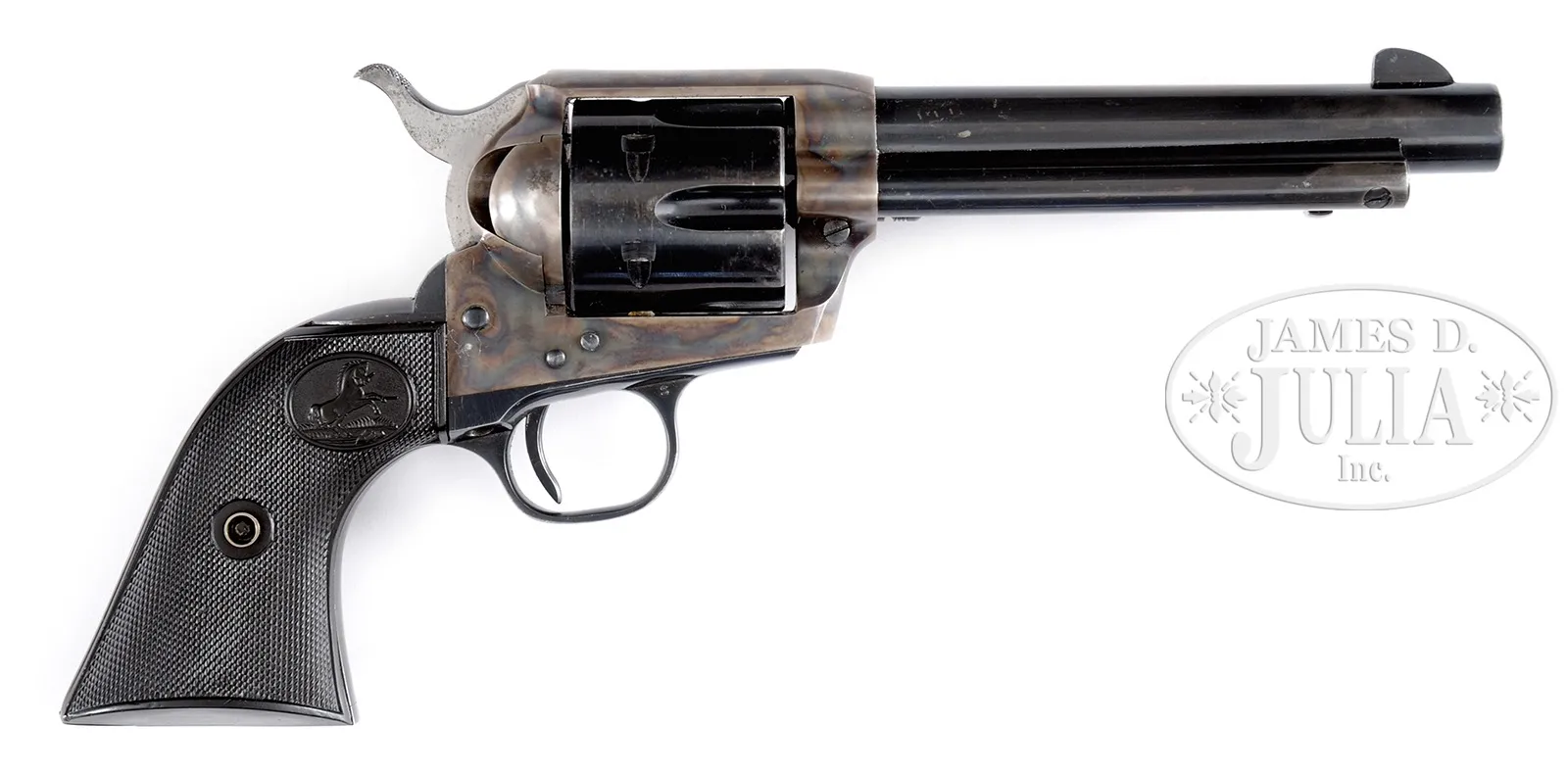 *2ND GENERATION COLT SINGLE ACTION ARMY REVOLVER WITH CHECKERED HARD RUBBER GRIPS IN COLT STAGECOACH BOX.SN 42063SA. Cal .357 MAG, 5-1/2″ bbl, blue and case color finish, checkered hard rubber grips. Bbl has 1-line address marked on top and Colt SAA cal mark on left side. Frame has 2-line patent mark on forward left side with rampant Colt logo with no circle to the right. SN matches on frame, trigger guard and backstrap. Cyl has last 3 digits of SN stamped on front face with “W” proof and a rampant Colt logo on the rear face. Grips have last 3 digits of SN scratched on the inside. “Alaska 1964 – Jazo, Monika, Paul Anita” is scratched on the inside of each grip. Box is standard stagecoach design from the 1950’s. Partition is for a 7-1/2″ revolver. End label is marked “357 5-1/2”. Bottom of box is not marked. Box contains Colt instruction sheet. PROVENANCE: The Brad Shepherd Collection. CONDITION: Very good. Bbl and ejector rod both have 70% faded blue finish with wear at the forward end. Markings are sharp. Sights are full sized. Bore is bright with strong rifling. Frame retains 70% muted case color worn bright on the loading gate with some erosion. There is some vivid color in the gullets in front of the cyl. Trigger guard retains 80% blue that is fading with a couple of rub marks on the fore-strap. Backstrap retains 80% faded blue with some scratching on the back. Hammer retains 90% thinning blue. Trigger also retains 90% thinning blue. Markings are sharp. Cyl retains 80% thinning blue with high point wear, sharp markings and a slight drag mark. Grips are very good with sharp checkering and only one small chip at the heal on right side. Box is very good with slight fraying on the cover and staining on the inside. A very interesting Colt Six-Shooter from the days of the Alaska Pipeline. 50062-45 TEP C&R (1,500-2,500) – Lot 1365 Click here to view provenance