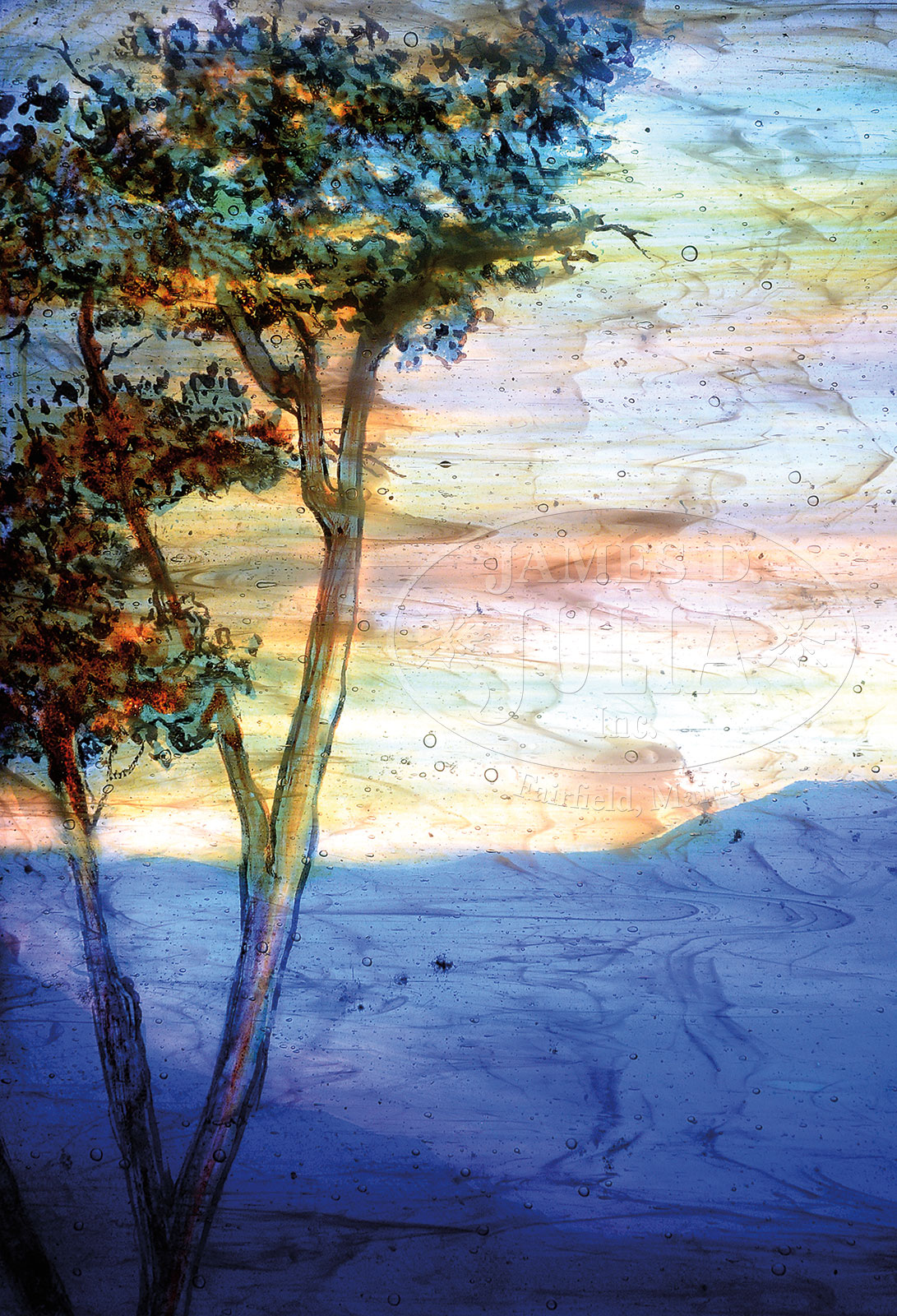 TIFFANY STUDIOS LEADED GLASS WISTERIA WINDOW.Exceptional Tiffany Studios window has multi-colored purple and blue glass forming the overall wisteria patterns. Each blue wisteria panel is plated on the back side with various panels of confetti and striated glass forming individual petals of the wisteria flower, giving great depth of color. A large panel of striated amber glass is painted on the backside with a scenic design of a tree and pond, which is then plated over with a red panel creating great depth in the window. The window is housed in a wooden frame. Unsigned. SIZE: 31″ w x 47-3/4″ tall overall. Window; 26″ x 43″. CONDITION: Good overall, with some tight hairlines. One trim panel has come out of the leading but is present, one trim panel is missing a small piece of glass, some corrosion to leading overall, primarily on the outside edges. 51088-35 (100,000-150,000) – Lot 1365