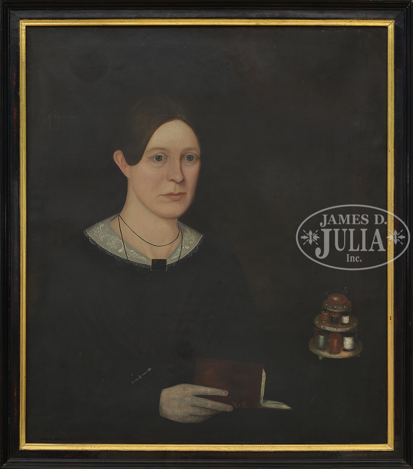 ATTRIBUTED TO AMMI PHILLIPS (American, 1788-1865) PAIR OF ANCESTRAL PORTRAITS.Two oils on canvas, housed in matching 19th century black and gilt lined frames. The naive portraits depict a seated woman holding her book of prayers with her sewing notions on the table beside her, while the gentleman attired in a black coat and white collar, is reading “The Mercury, Weekly Journal of Commerce”. SIZE: 29-1/2″ x 25-1/2″ (each). Overall: 32-1/2″ x 28-1/2″. CONDITION: Both canvases have been lined and have surface grime. Gentleman has flake losses in the background and restoration throughout, including his face; woman has several areas of restoration in background and dress, only minor touch up in face. 9-96772 (5,000-7,000) – Lot 1366