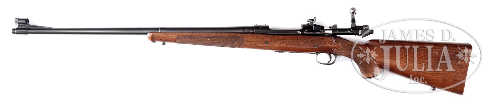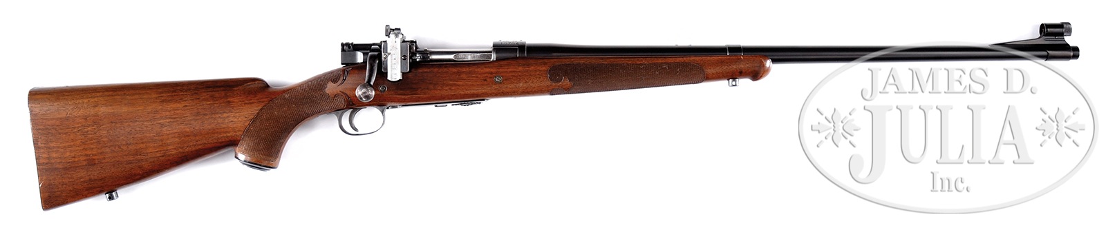 *CUSTOM SPRINGFIELD 1922 MII SPORTING RIFLE.SN 15764B. Cal. 22 LR. 24″ military bbl, caterpillar front sight, bbl band sling swivel. Military action has Springfield legend and SN on front ring, checkered bolt, 5-round rim fire magazine integral with floorplate. Lyman receiver sight. Military trigger. Re-purposed military stock with stylized fleur-de-lis checkering, Schnabel forend, twin cross bolts, finely checkered steel buttplate, extended pistol grip w/bakelite cap. CONDITION: Fine. Gun retains most of its orig custom finish with only minor rubs and marks from usage. Mechanics crisp, bright bore. 50433-3 JWD (2,000-3,000) C&R – Lot 1366