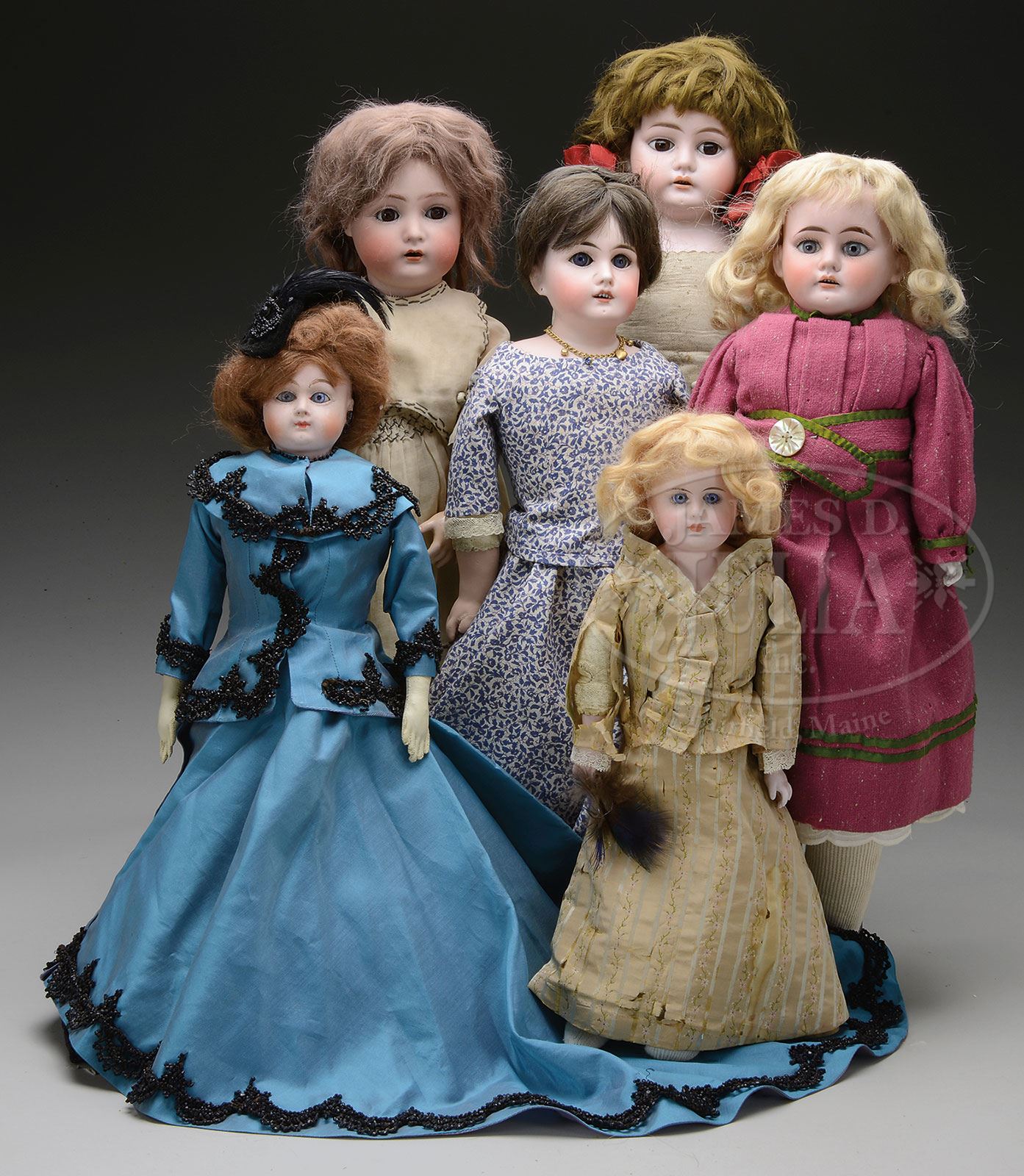 LOT OF 6 MISCELLANEOUS GERMAN DOLLS.Largest is a bisque shoulder head with brown glass sleep eyes with a “Horseshoe” mark on the back of the shoulder; doll in plum colored wool dress is also a shoulder head with fixed blue glass eyes, also with the “Horseshoe” insignia; doll in blue and white floral print dress is also a shoulder head with and embossed “5” on the back of the shoulder; doll in blue fashion dress is a composition swivel neck on separate composition shoulder on a leather body; smallest doll in gold silk dress is a closed mouth shoulder head solid dome incised on back of shoulder “33.24” somewhat resembles a S&H 939; the only bisque socket head in the lot is incised “K&R403″ and has blue glass sleep eyes and a composition walking body. SIZE: Largest is 23″ t (58cm), smallest is 14-1/2” t (37cm). CONDITION: Over all good condition with typical age wear. 1-14349 (500-800) – Lot 1370 Auction: Advertising, Toy & Doll Auction - Fall 2014 Please Note: All prices include the hammer price plus the buyer’s premium, which is paid by the buyer as part of the purchase price. The prices noted here after the auction are considered unofficial and do not become official until after the 46th day. |