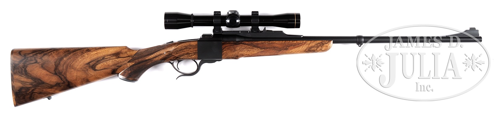 *SUPERB SPECIAL ORDER DAKOTA ARMS MODEL 10 RIMFIRE SINGLE SHOT RIFLE.SN DRG22LR. Cal. 22 LR. 23″ sporter bbl with ramp front sight and quarter rib rear, bbl band sling swivel, falling block action with rimfire breechblock. Honey gold marble cake English walnut stock with multi-point checkering, inletted sling swivel stud and trapdoor grip cap, matching smooth walnut buttplate. Leupold 4x scope in Talley bases and rings. CONDITION: Very fine, as new. Mechanics crisp, bright shiny bore, optics clear. A rarely encountered rimfire example from one of America’s best custom makers. 50433-4 JWD (4,000-6,000) – Lot 1370