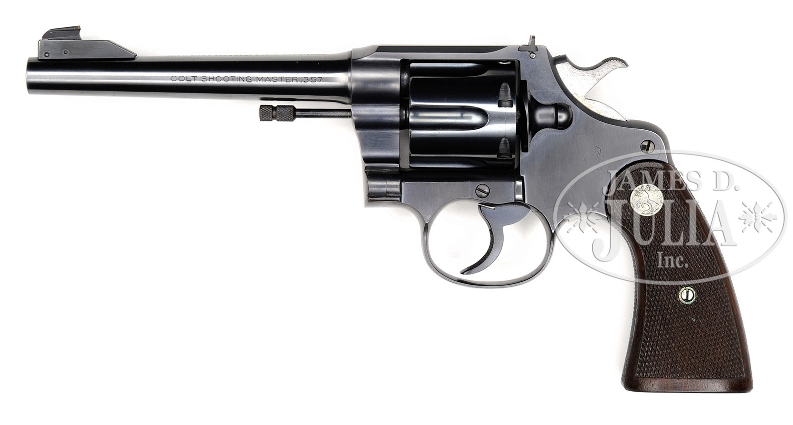 *SCARCE COLT SHOOTING MASTER DA TARGET REVOLVER.SN 341833. Cal. 357 Magnum. Blue finish with 6″ tapered rnd bbl, adjustable front & rear sights. Front sight is a King mirrored gold bead on a ramp. It has 2-line bbl address and is marked on left side “COLT SHOOTING MASTER .357”. Frame is flat top style and it has the Rampant Colt logo on the sideplate. Mounted with silver medallion checkered walnut grips. Trigger, front & back straps are checkered. The Shooting Master revolvers were built on the New Service frame with a more streamlined bbl and the new style adjustable sights with a hand honed action. These revolvers usually saw hard service on target ranges as well as with law enforcement. PROVENANCE: Robert H. Haskell, III Estate Collection. CONDITION: Extremely fine plus, appears to be new & unfired. Overall retains 99%+ crisp orig factory finish with only a faint cyl line. Mechanics & grip are crisp, brilliant shiny bore. 4-50253 JR205 (2,000-3,000) – Lot 1371