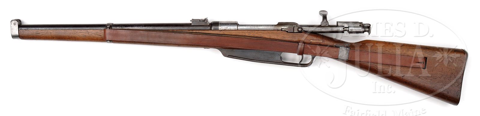 *◊ Kar88, MADE IN 1906 BY VICTOR CHRISTIAN SCHILLING, IN SUHL.SN 1406. Cal. 7.92mm. This Kar88 carbine is completely matching and notable for its late date of manufacture. It was several more years before the German Cavalry adopted a short rifle, so these Mannlicher Kar88 carbines continued in service for an extended period of time. The rifle is well marked. The receiver ring reads “VCS / Suhl / 1906”. The carbine has commercial German prewar proof marks. Side-rail reads “GEW88”. The rifle SN “1406” is repeated on the bolt & its parts, receiver, bbl and magazine assembly. The walnut stock is unnumbered & has only two Imperial inspection marks, both on the underside of the buttstock. The bbl bands, receiver and bolt are in the white. Carbine has no unit marks whatsoever. A leather sling is present, but is more contemporary, and probably made for a Kar98k. PROVENANCE: Collection of Dr. Geoffrey Sturgess. CONDITION: Blued finish on metal parts is beginning to fade to dark grey. Bolt & receiver originally in the white are also starting to fade, particularly the bolt handle. Bluing on the bbl is good, and retains 40-50% finish. In certain areas there has been corrosion, which has been removed, leaving a white area. Stock is good and solid but has been worked on. The stock suffered from significant dents, which have been cleaned & filled with wood filler of a color so light as to be easily noticed; light color marks occur near the upper sling band on both left & right side, with the right side being particularly obvious; there is a 3rd mark in the stock just below the cocking piece; pressure marks & dents are minimal. Inspection marks on buttstock are clear & crisp. Bore is shiny & bright, very good with strong rifling. Crown is very good. Mechanics are excellent. 4-53184 JJW32 (1,000-1,500) – Lot 1373