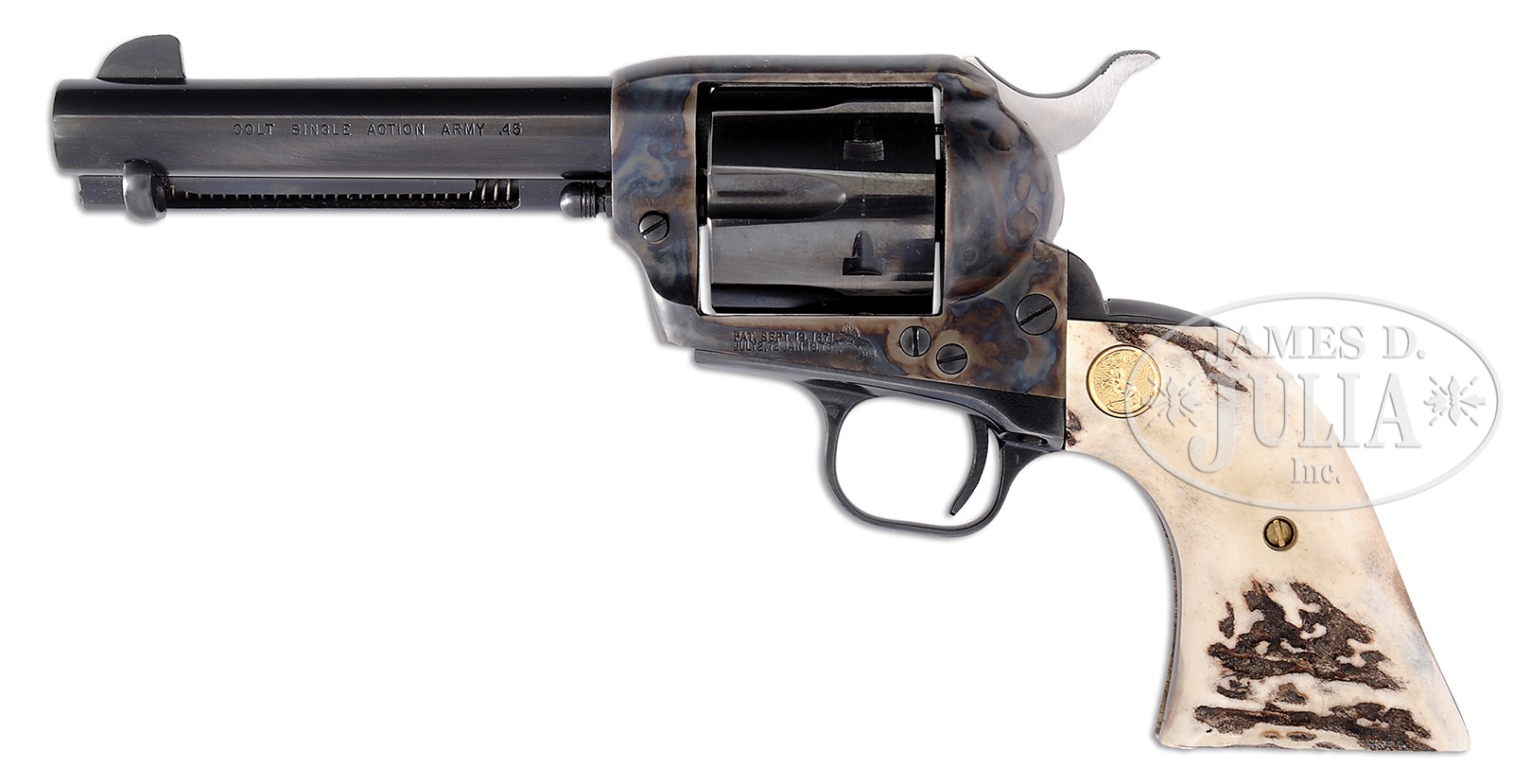 Please Note: This is NOT C&R eligible, it IS a Modern Gun. ALSO Please Note: As the title states, this is a 3rd Generation Colt. There is a typographical error near the end of the description referencing 2nd Generation, but of course it is a 3rd Generation. *3RD GENERATION COLT SINGLE ACTION ARMY REVOLVER WITH STAGHORN GRIPS.SN 88691SA. Cal .45 COLT, 4-3/4″ bbl, blue and case color finish, 2-pc Staghorn grips. Bbl has standard 1-line address on the top and Colt SAA cal mark on left side. Front sight is of the thick high type. Frame has 2-line patent mark on the forward left side with rampant Colt logo, with no circle to the right. SN matches on frame, trigger guard, and backstrap. Last 4 digits of SN is stamped on front face of cyl. Grips have “AJAX Grips” marked on inside of right grip. Grips have gold Colt style medallions. Also included are a set of checkered hard rubber grips that are numbered to this revolver. PROVENANCE: The Brad Shepherd Collection. CONDITION: Very fine to excellent. Bbl and ejector rod housing retain nearly all of the orig blue finish, with very slight edge wear. Markings are sharp. Front sight is full sized. Bore is bright with strong rifling. Frame retains nearly all of the orig case color finish. Hammer has a slight scratch on left side but otherwise has all the finish. Trigger and screws also retain nearly all the orig blue finish. Trigger guard and backstrap retain 99% blue with a slight scratch on the left side by the front trigger guard bow and a small stain at the toe of the butt. Cyl retains 99% blue with a very slight drag mark. Chambers are clean. Stag-grips are fine with no losses. Hard rubber grips are also fine. An opportunity to obtain a nearly new 2nd Generation Colt Single Action in a popular cal and bbl length. Manufactured in 1977. 50062-59 TEP C&R (1,250-1,750) – Lot 1373