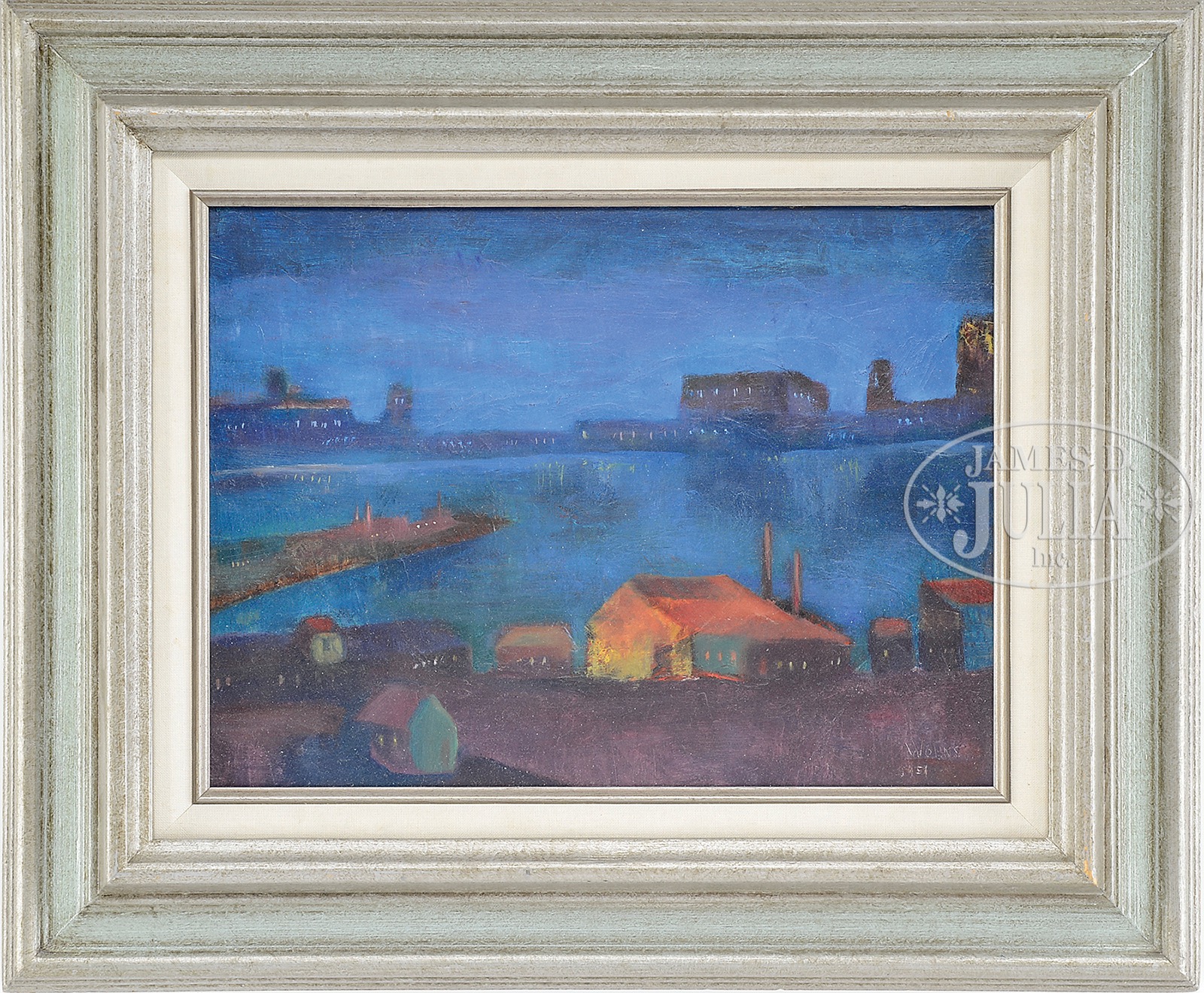 JOSEPH WOLINS (American, 1915-1999) TWO WORKS: “INDUSTRIAL NIGHT” AND “KING DAVID AND THE CONCUBINES”.Oil on masonite Housed in painted molded wood frames 1) Signed lower right “Wolins 1951” 2) Signed lower left “Wolins” SIZE: 1) 12″ x 16″. Overall: 19-3/4″ x 23-3/4″. 2) 16″ x 20″. Overall: 24-1/2″ x 28-1/2″. CONDITION: Very good 51557-1 (50-100) – Lot 1374
