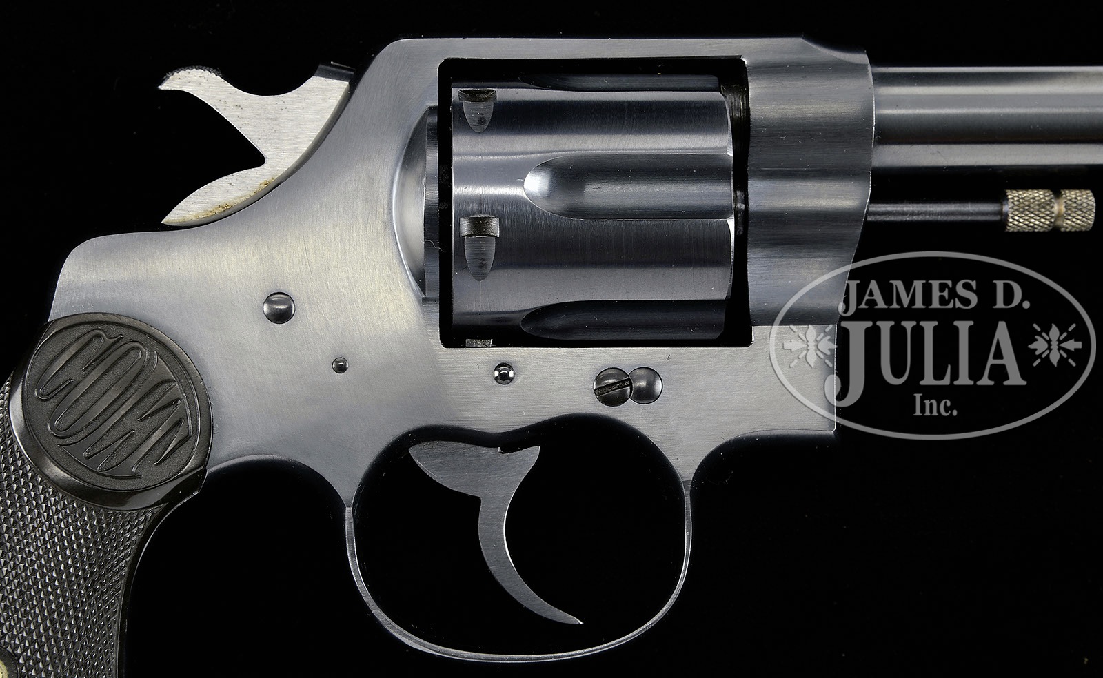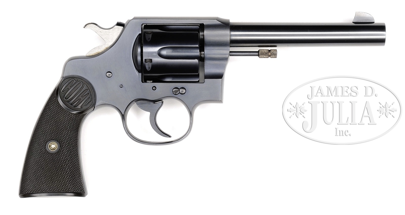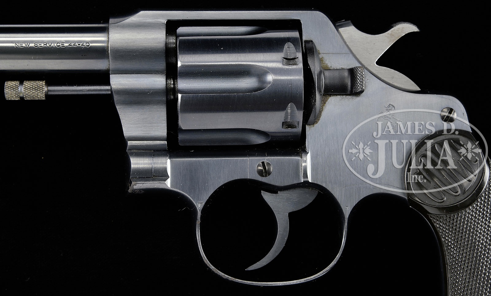 *COLT NEW SERVICE DA REVOLVER WITH ORIGINAL BOX.SN 336948. Cal. 44-40. All blue finish with 5-1/2″ bbl, fixed sights, 2-line address with model & caliber marking on the left side. Cyl latch is the earlier hook style and it has the Rampant Colt logo on the sideplate. Mounted with 2-pc checkered hard rubber grips with oval “COLT” embossed at the top. Accompanied by its orig 2-pc, burgundy cardboard box with dark blue & white end label with correct information about this revolver. Bottom of the box has matching SN. PROVENANCE: Robert H. Haskell, III Estate Collection. CONDITION: Extremely fine plus, appears to be new & unfired. Overall retains 99%+ crisp orig factory blue. Grips & mechanics are crisp, brilliant shiny bore. Box has two broken corners in the lid and is missing about 15% of its burgundy paper cover; label is missing about 40%. 4-50249 JR193 (2,000-3,000) – Lot 1377
