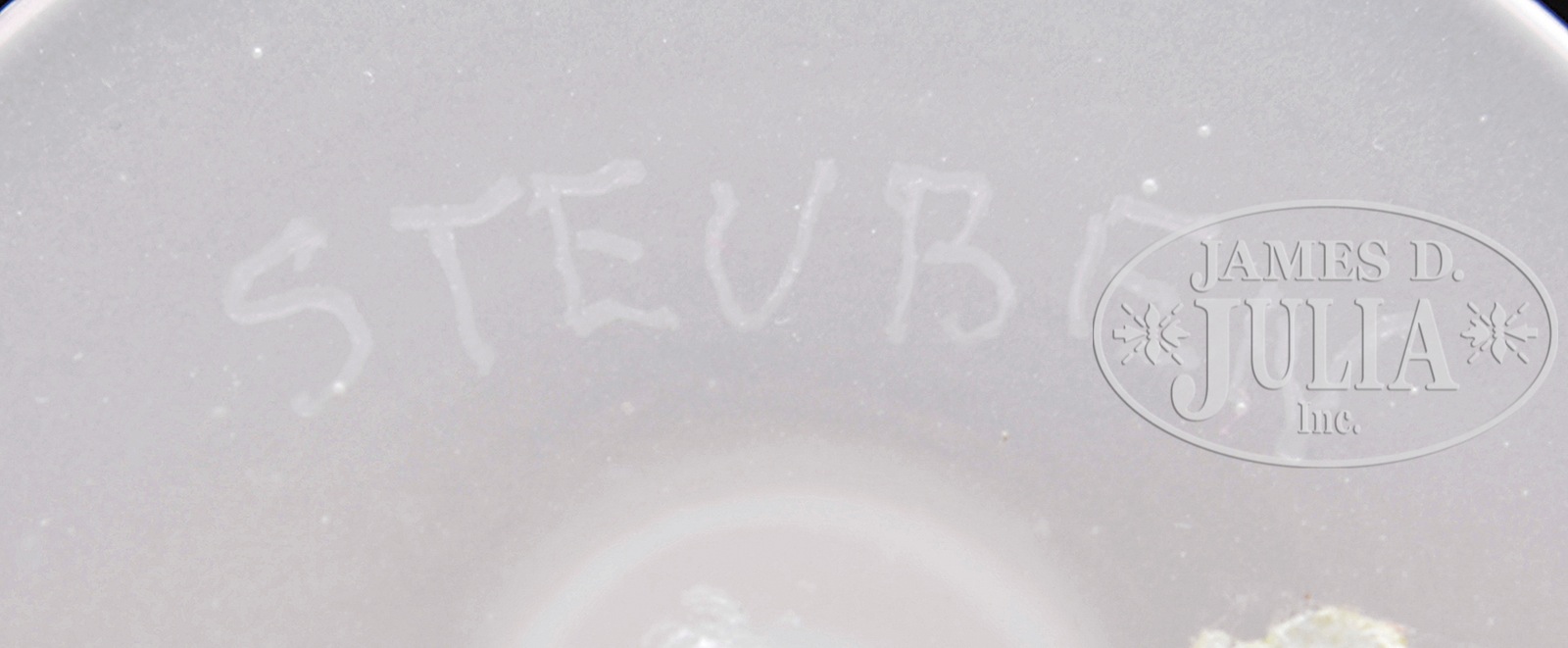 THREE STEUBEN ITEMS.1) Steuben Verre de Soie compote has inverted saucer foot, hollow blown stem, and flaring bowl. Interior of bowl has stretched iridescence with strong red, blue and green highlights. Bowl is finished with an applied blue lip. Unsigned. 2) Steuben calcite vase has large inverted saucer foot and is finished with a wide ruffled rim. Unsigned. 3) Steuben cordial has alabaster foot and stem leading to a rosaline bowl. Signed on the underside with etched block letters “Steuben” and script “F. Carder”. SIZE: 1) 7-1/2″ t x 10″ dia. 2) 4″ t. 3) 6″ t. CONDITION: All are very good to excellent. 5-68213 (700-1,000) – Lot 1378