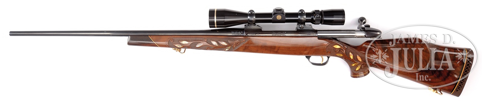 *WEATHERBY HIGHLY ORNATE MARK V DELUXE BOLT ACTION RIFLE.SN P45100. Cal. 300 WBY Mag. German manufactured Mark V action with 24″ sporter weight bbl. Includes original red Weatherby hard case with key as well as 6 boxes orig Weatherby Ammunition, 4 boxes 150 gr less 2 cartridges, 1 box 110 gr, 1 box 220 gr. Spectacular rifle with many custom features. California style Monte Carlo cheek piece stock of exhibition qualify claro walnut with high gloss finish. Stock features rosewood forearm tip and grip cap with dbl spacers, having diamond shaped inlay in grip cap with diamond shaped vacant gold engraved name plate between 2 pearl inlays on bottom of forend. Grip and forearm areas have elaborate vine type hand carved panels with stippled backgrounds. Each panel includes 6 leaf shape California Abelone shell inlays. Gold plated quick detach sling swivels. LOP: 14-1/2″ over Weatherby ventilated pad. Floor plate and trigger guard have full coverage foliate engraving with vignette featuring raised gold grizzly bear. High polished bbl and action accented by gold plated trigger, jeweled bolt and 2-panel checked bolt knob. Fitted with a Leupold Vari-X-III 3.5 X10 gloss finish scope with duplex reticle on Buehler mounts. PROVENANCE: Gerard Ruth Collection. CONDITION: Very good high polish blue. Stock has very good gloss finish showing scattered scratches, scuffs and handling marks. Very good bore. Scope is in good condition and has clear optics. Case in extremely fine condition as are all but 1 of the ctg boxes. 51036-28 DS (10,000-15,000) – Lot 1378