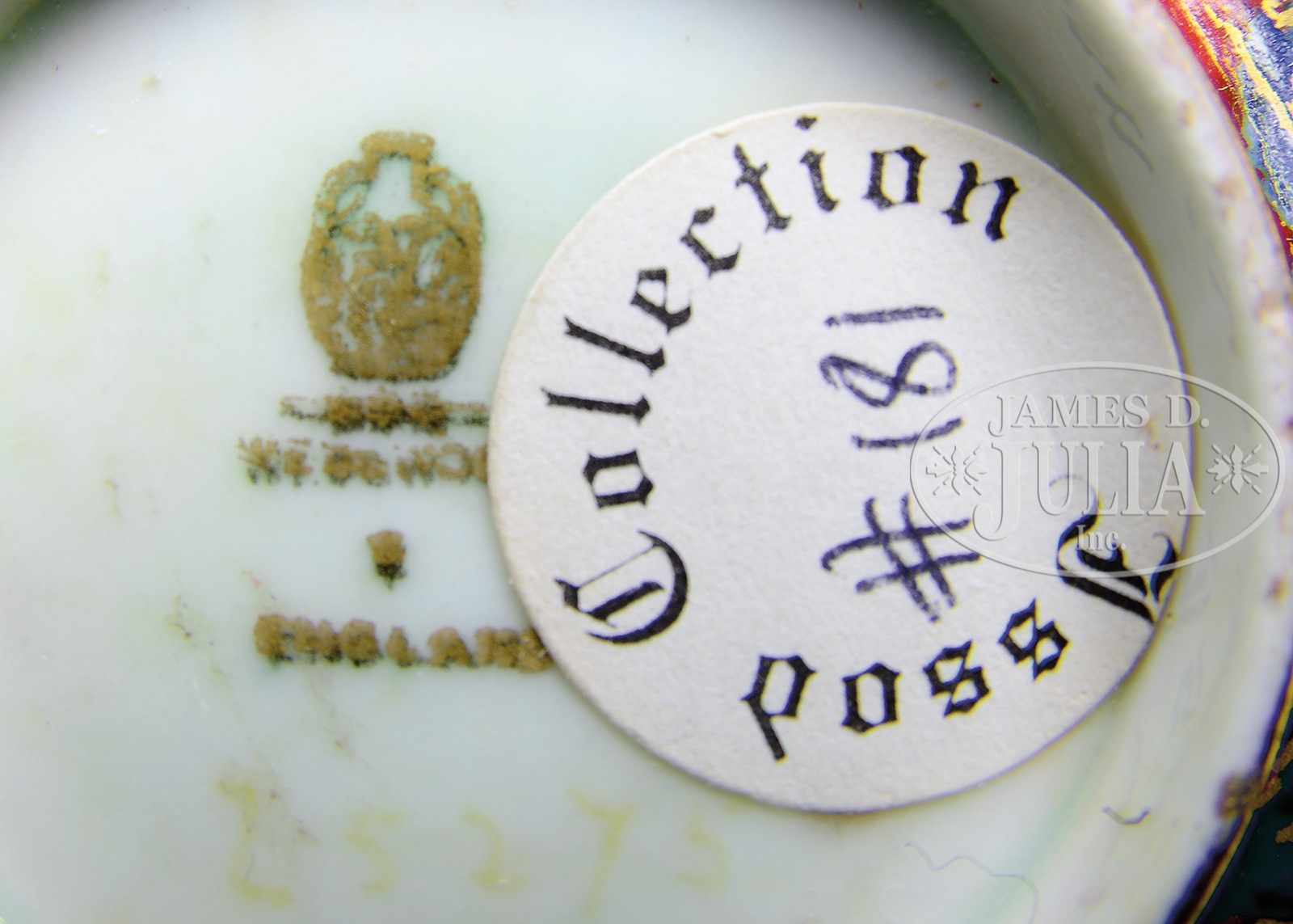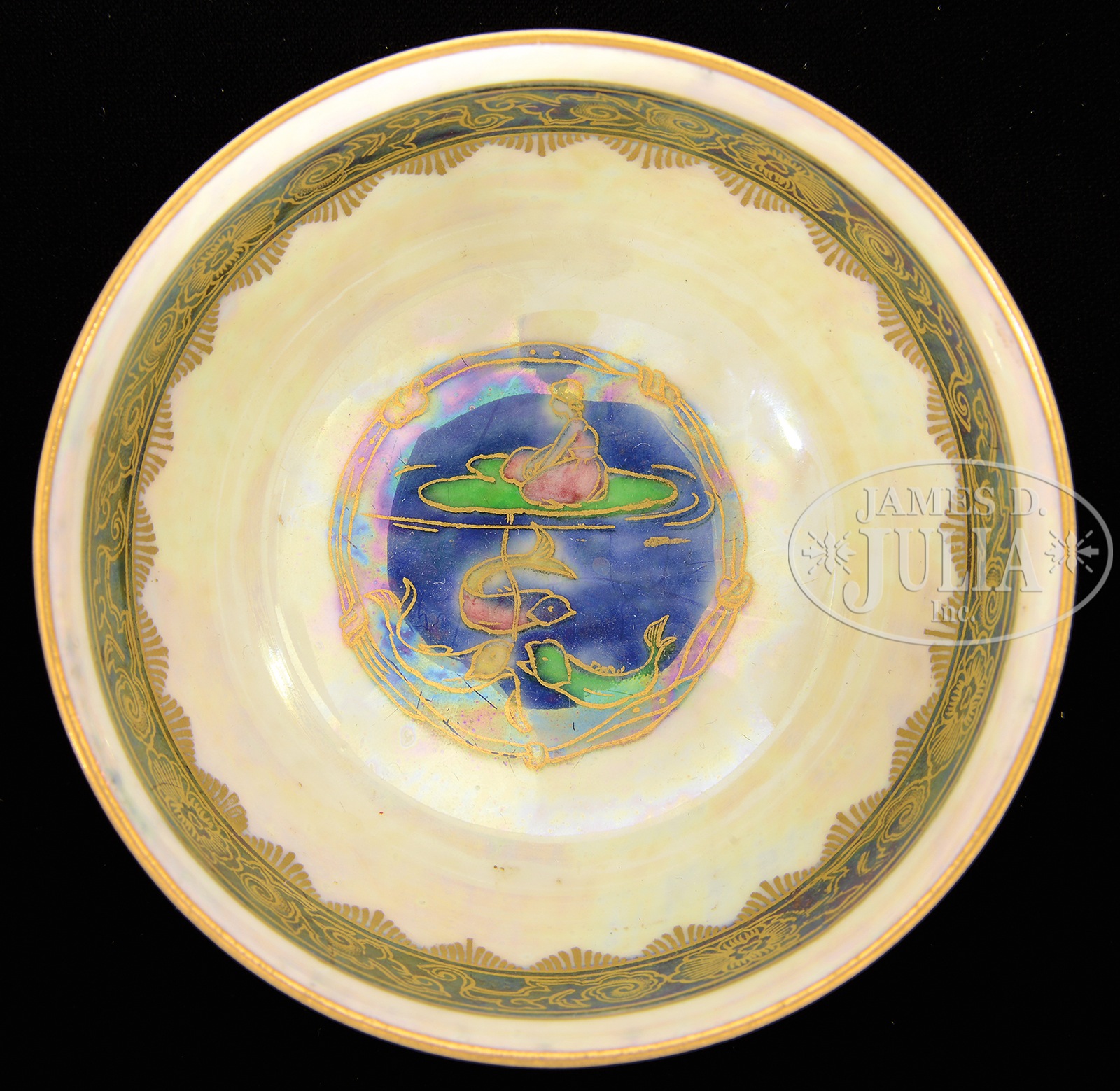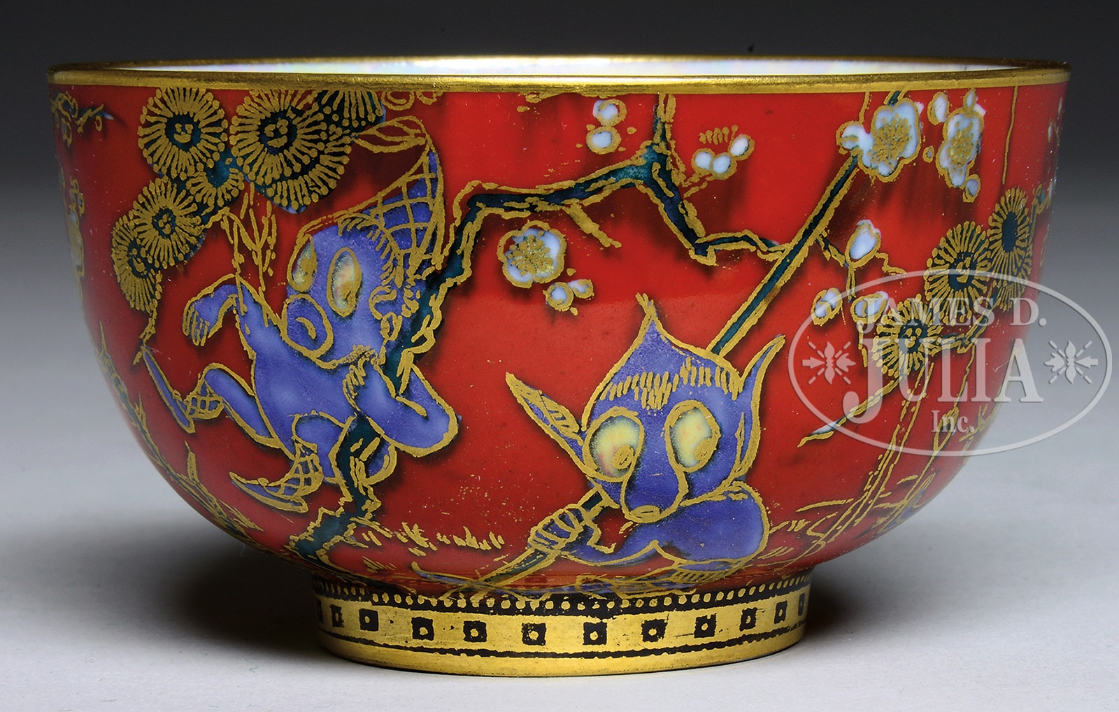 WEDGWOOD FAIRYLAND LUSTRE FIRBOLGS BOSTON CUP.Wedgwood Fairyland Lustre Boston cup is decorated on the exterior in the Firbolgs pattern with blue firbolgs against a red background. Interior of the cup is decorated with a center medallion with a fairy on a lily pad with colorful fish swimming below. All against an opal lustre background. Cup is signed on the underside with gold Portland vase mark, “Wedgwood England”. The cup also carries a paper tag Issod Collection #181. SIZE: 3-1/2″ dia. PROVENANCE: Betty Issod Collection. CONDITION: Very good to excellent. 18655-1 (1,000-1,500) – Lot 1379