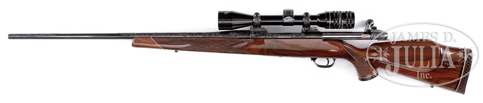 SN P70188. Cal. 270 WBY. Mark V Deluxe with skip line checkering. 24″ bbl with “J.P. Sauer & Sohn” markings at bottom of bbl with extensive engraving covering most all receiver, bbl, bolt cocking assembly, rings and bases, and floorplate. Engraving is done in a Germanic vine and scroll and is well executed. It is signed by the engraver on the bottom in script “CEC” and dated “89”. As well as being engraved, there is a heavy gold inlay on floorplate of a bugling elk. Mounted in Cone-trol split rings and bases. Is a Weatherby premiere variable 3-9 scope that appears to be period to the manufacture of the rifle. Traditional high polish Weatherby highly figured walnut stock with Weatherby marked white line recoil pad. CONDITION: Exceptionally fine. Shows very little use with some very minor handling marks in the stock finish. Metal is excellent plus with no evidence of finish loss. Bore and mechanics are bright and crisp. Optics function properly and are clear and bright. 51035-1 TDW (3,000-5,000) – Lot 1379