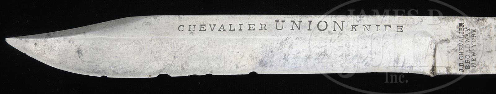 RARE CIVIL WAR CHEVALIER “DEATH TO TRAITORS” UNION BOWIE KNIFE AND ORIGINAL SHEATH.The motto says it all “DEATH TO TRAITORS” emblazoned in large letters on right side. John D. Chevalier was a well known New York City cutler famous for surgical instruments. Few of his Bowie knives, however, are known of this unique pattern with brass and checkered ebony grip. This well made clip point knife measures 13-1/4″ overall with 9″ clip-point blade. Norm Flayderman in his text The Bowie Knife Unsheathing an American Legend shows two examples with variant “brass spurs” that fit special scabbard throats. Our example here was made without these brass projections and this is clearly seen in that the orig protective leather washer is still present with no provision for these projections. Flayderman states “the application of slogans such as Death to Traitors is an unusual feature on American-made Bowies. Chevalier was one of the very few to occasionally employ the method”. The accompanying scabbard is unquestionably original to this knife and has a distinctive scalloped brass tip. A known sixth plate tintype of Union soldier with this knife clearly shows the distinctive brass tip identical to the one on this knife. Sheath is missing the throat. CONDITION: Very good overall. Markings are excellent as can be seen in photos with only minor losses. Blade is bright/grey with staining and pinprick pitting, old sharpening with several large chips in cutting edge. Blade is still extremely sharp. Ebony grip slabs are very good and well fit. Brass handle and scabbard drag have brass mustard colored patina. Orig serrated leather protective washer still present. Accompanying scabbard is sound and solid still retaining wood liners. though missing throat. 4-54472 JS (6,000-8,000) – Lot 1382