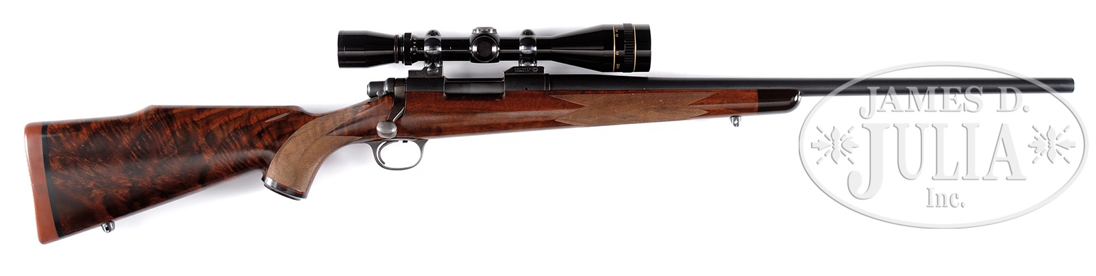 *GORGEOUS REMINGTON MODEL 700 CUSTOM BOLT ACTION RIFLE.SN 6268492. Cal. 223. 22″ Shilen heavy sporter custom bbl. Model 700 bolt action receiver. Walter S. Abe custom high grade Monte Carlo buttstock with marble cake figure. Ebony forend cap. Ebony capped pistol grip with Abe logo. Fine line borderless checkering. Solid red recoil pad. Sling swivels. Leupold 3×9 variable scope. PROVENANCE: Remarkable William Larkin Moore Private Estate Collection of Fine Sporting Arms. CONDITION: Fine. Bbl shows minor handling marks. Assorted minor handling marks in wood. Bore needs cleaning. Optics clear. 50595-44 TJW (2,500-3,750) – Lot 1382