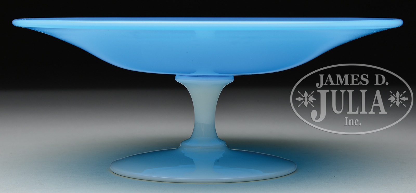 STEUBEN BLUE JADE COMPOTE.Wonderful Steuben compote has light blue jade bowl with applied calcite foot & stem. Unsigned. SIZE: 8″ dia. x 3″ t. PROVENANCE: Linda Southworth Collection. CONDITION: Very good to excellent. 5-68292 (600-900) – Lot 1383