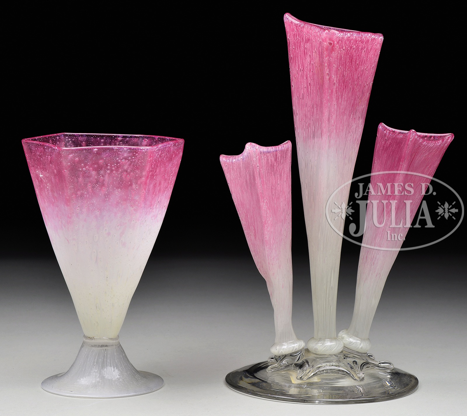TWO STEUBEN PINK CLUTHRA VASES.1) Steuben Cluthra vase has hexagonal flaring body with pink Cluthra shading to white. The vase is finished with an applied matching foot. Signed on the underside with etched block letters “Steuben”. 2) Steuben three pronged vase has gold ruby shading to white Cluthra vases on an applied clear glass foot. Footed tumbler is signed “Steuben” in block letters. Both items carry an original paper label from “Rockwell’s Corning New York”. SIZE: 1) 6-1/2″ t. 2) 9-3/4″ t. PROVENANCE: Linda Southworth Collection. CONDITION: Both are very good to excellent. 5-68297 (500-900) – Lot 1384