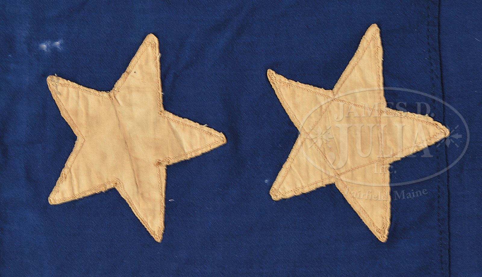 RARE & UNUSUAL CIVIL WAR 11 STRIPE AND 33 STAR FLAG.33 star flag was official at the outbreak of the Civil War representing the State of Oregon which became a state July 4, 1859. Kansas was brought in as a state officially July 4, 1861, so 33 stars adorned the flag at Ft. Sumter when fired upon. This particular flag is well made of light weight blended bunting with cotton stars and hoist. Flag utilizes a sewn-in rope hoist, possibly for ships use. Flag measures 74″ on hoist and 104″ on fly and was probably longer when orig made. Fly end has numerous contemporary repairs and additions, keeping it in use. This is an unusual Civil War flag that appears to have seen a fair amount of use. CONDITION: Flag is good to very good overall with good colors, areas of soiling, insect damage, fraying and repairs at fly end. Flag has several contemporary repairs and a couple more recent as noted by different thread types. Flag is constructed with a mix of hand stitching and a chain stitch not typical of Civil War flags, though we believe it is of Civil War era origin made with a machine that was quite rare (we have examined at least one documented Civil War Confederate National flag made in Bermuda with the same style of stitch utilizing similar two-ply “S-twist” machine thread). The lack of additional two stripes could potentially represent the 11 seceding states and that could explain the unusual construction as we know of no Civil War flags manufactured in the continental United States utilizing the sewing machine noted. 4-55343 JS (3,000-5,000) – Lot 1386