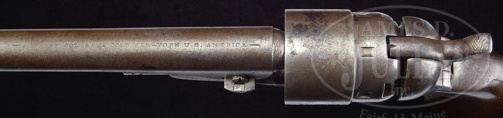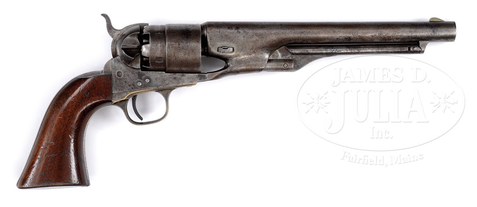 CIVIL WAR INSCRIBED COLT M-1860 PERCUSSION ARMY REVOLVER TO GEORGE F. SEAVER, 3RD RI ARTILLERY.SN 41361. This is a nice example of an all orig and matching rare Civil War produced civilian Colt Army Revolver. Inscription on inside of backstrap reads “LIEUT. G. F. SEAVER RHODE ISLAND ARTILLERY”. Seaver enlisted February of 1862 and was stationed on the coasts of Georgia and South Carolina where he saw duty during the bombardment of Ft. Pulaski and its capture. At Buford, South Carolina on February 12, 1863, he was attacked by a Private of his company, Michael Duffy, who inflicted a “dangerous wound” with a knife to his neck. Private Duffy was court-martialed, found guilty and sentenced to death by firing squad. Lt. Seaver was discharged October 28, 1863. His side arm shows honest use with crisp, fine markings, all matching and complete. CONDITION: Gun is very good overall. All SNs match, traces of finish are found in protected areas, though gun is mostly grey/brown with scattered areas of staining and pitting. Safety pins are mostly intact and cyl scene is about half discernible. Stocks are sound, solid, well fit and retain over 90% of their original varnish with edge wear and chipping at left inside toe. Mechanically, gun is sound with crisp, well defined bore. 4-54458 JS (4,000-6,000) – Lot 1390 Click here to view provenance